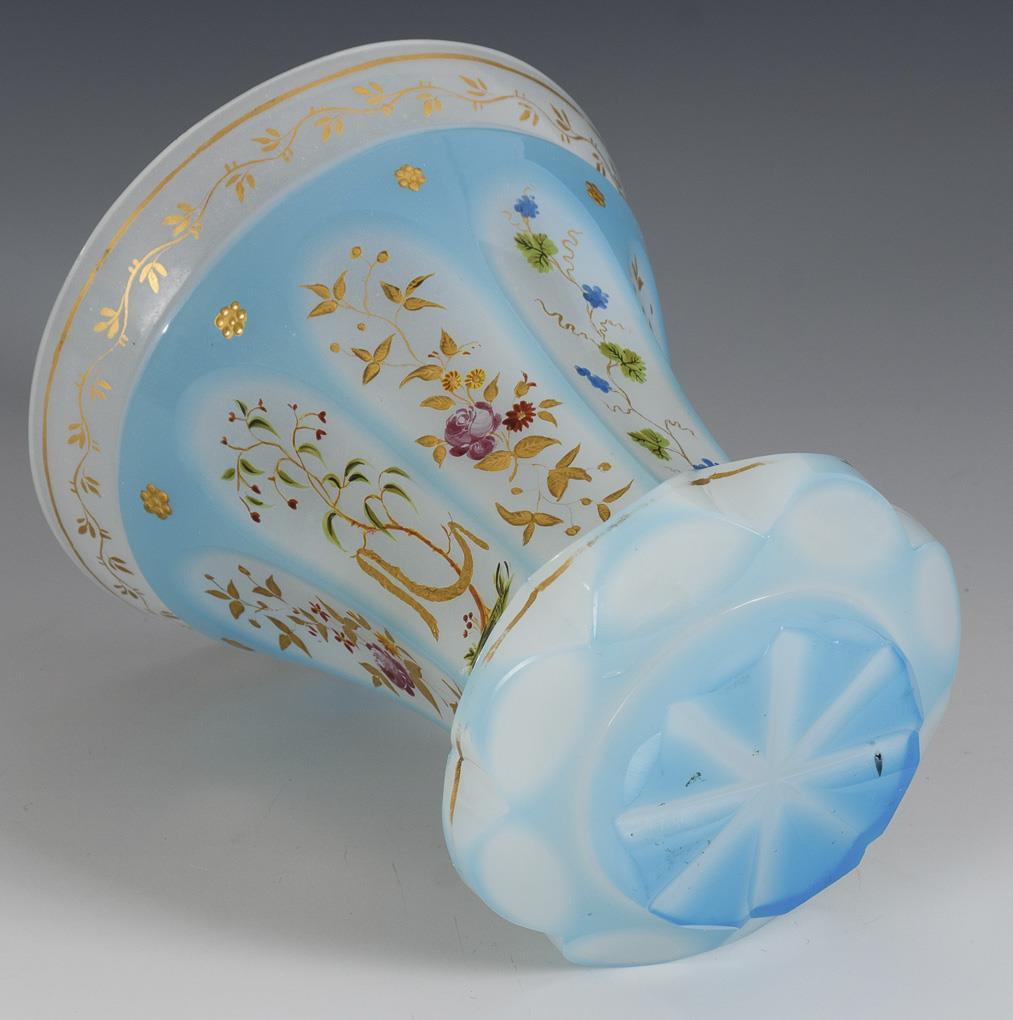 Weißes Alabasterglas mit hellblauem Überfang, polychrome Emailmalerei, Reliefgoldmalerei. H 12,5 cm.