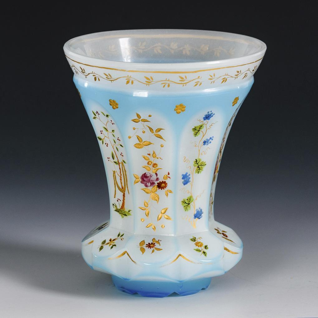 Weißes Alabasterglas mit hellblauem Überfang, polychrome Emailmalerei, Reliefgoldmalerei. H 12,5 cm.