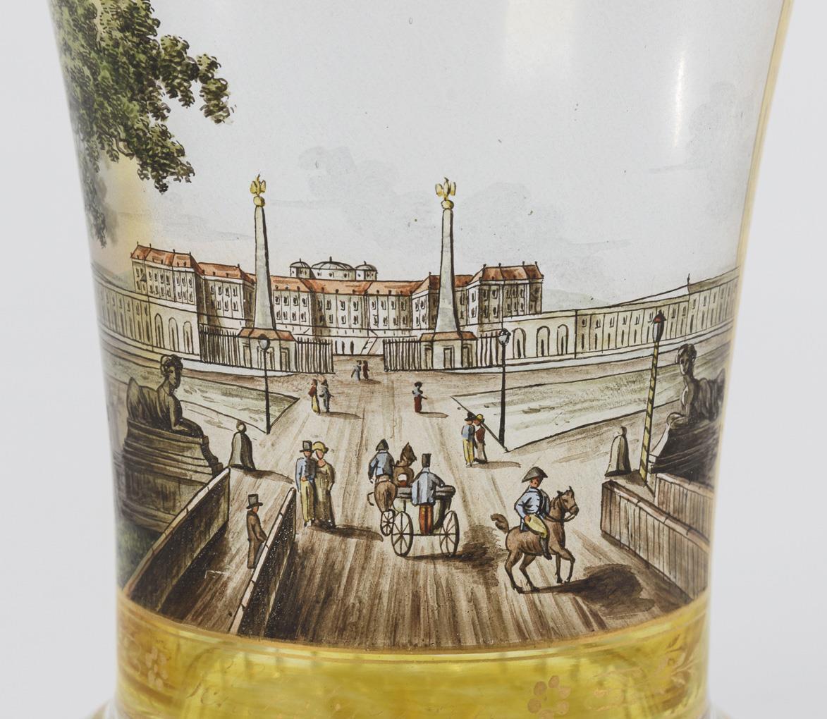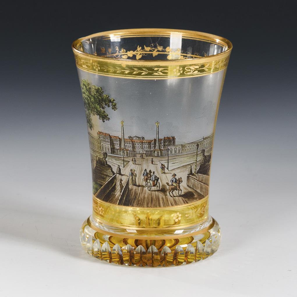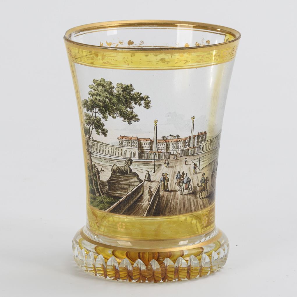 Im Stil der Kothgasser-Gläser gearbeiteter Ranftbecher mit Kerbschliffkranz am Fuß und Bodenstern. Schauseitig eine Kartusche mit der bezeichneten Ansicht des Schlosses Schönbrunn in Wien. Minimale Randbestoßung, 1 herstellungsbedingte, beschliffene Randbestoßung, minimale Goldbereibung.