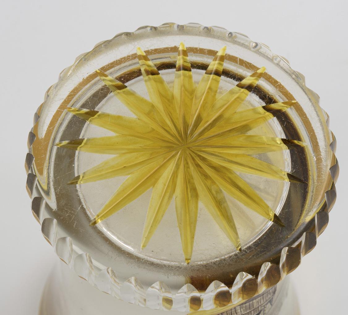 Farbloses, teils gelb gebeiztes Glas, polychrome Transparentemailmalerei, Goldstaffage. H 11 cm.