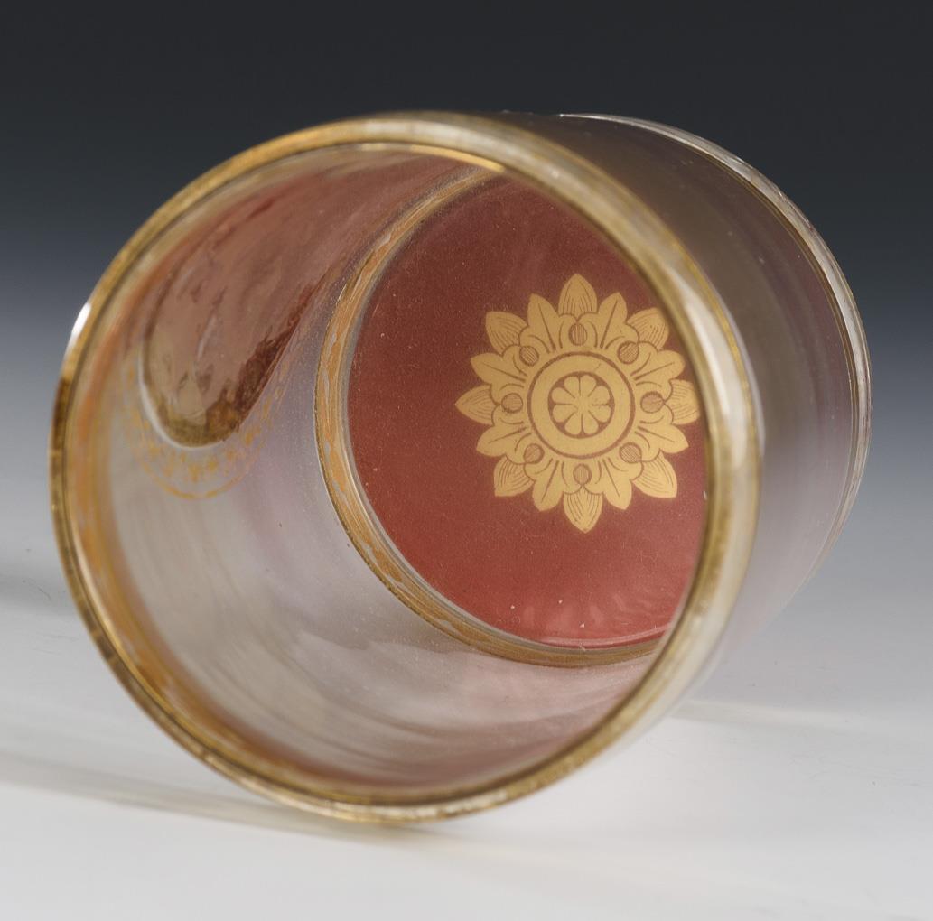 Zylinderbecher, schauseitig ein Ovalmedaillon mit einer goldgemalten und gravierten und mit einer roten Folie hinterlegten Christusdarstellung, goldene Bodenrosette über roter Folie. Medaillon mit Spannungsriss, Folie defekt, Spannungsriss am Stand, Gold berieben.