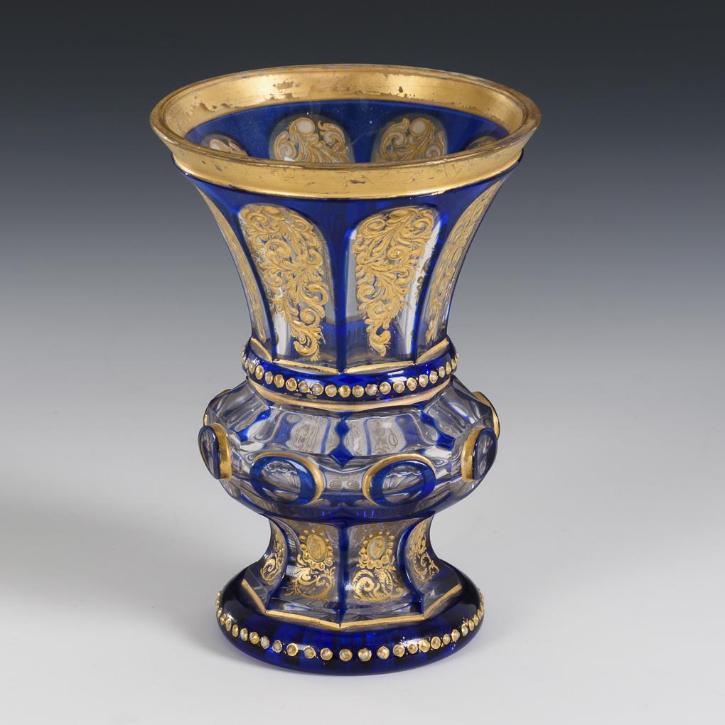 Farbloses Glas mit kobaltblauem Überfang, Facetten- und Linsenschliff, Reliefgold. H 13,5 cm.
