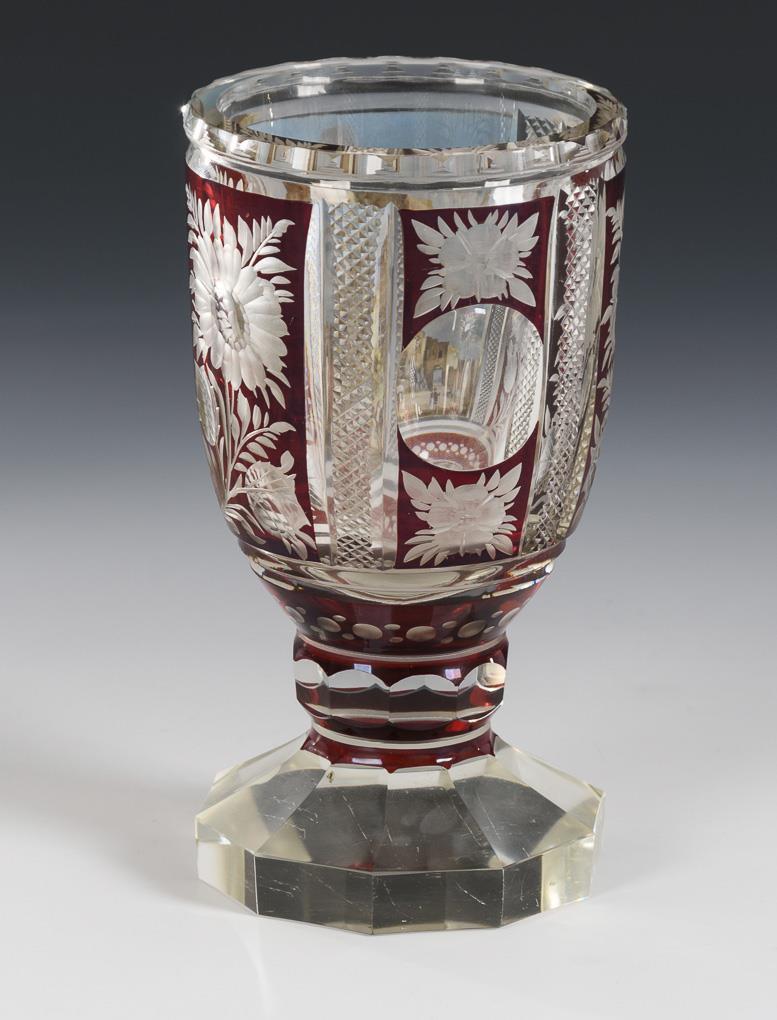 Farbloses, teils rot gebeiztes Glas, polychrome Transparentemailmalerei. H 16 cm.