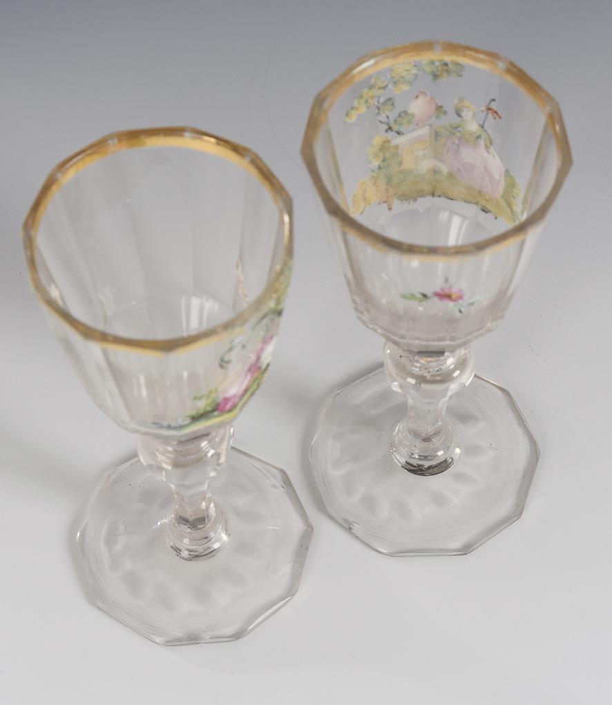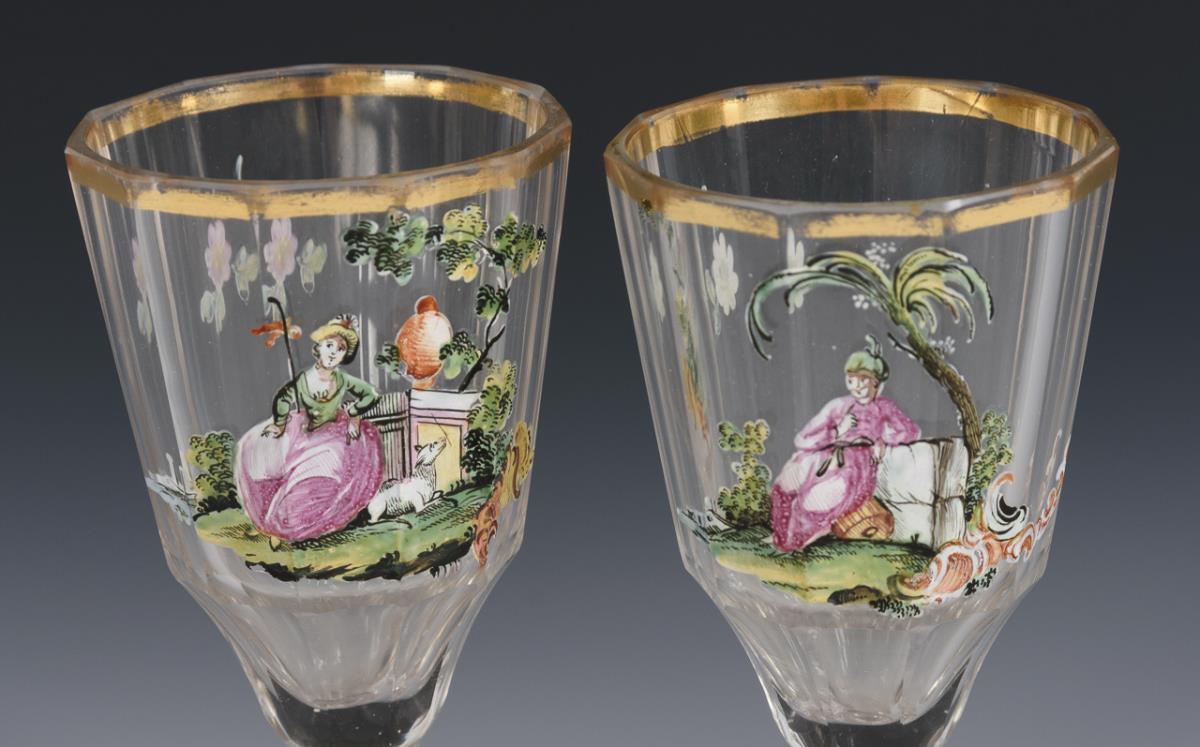 Facettierte, am Ansatz eingezogene Kuppa, facettierter Balusterschaft, oktogonaler Fuß mit Linsenschliff. Schauseitig jeweils die Darstellung einer barocken Dame bzw. eines Herren mit Turban in einer Parklandschaft. Gold berieben, jeweils 2 Chips am Fuß.