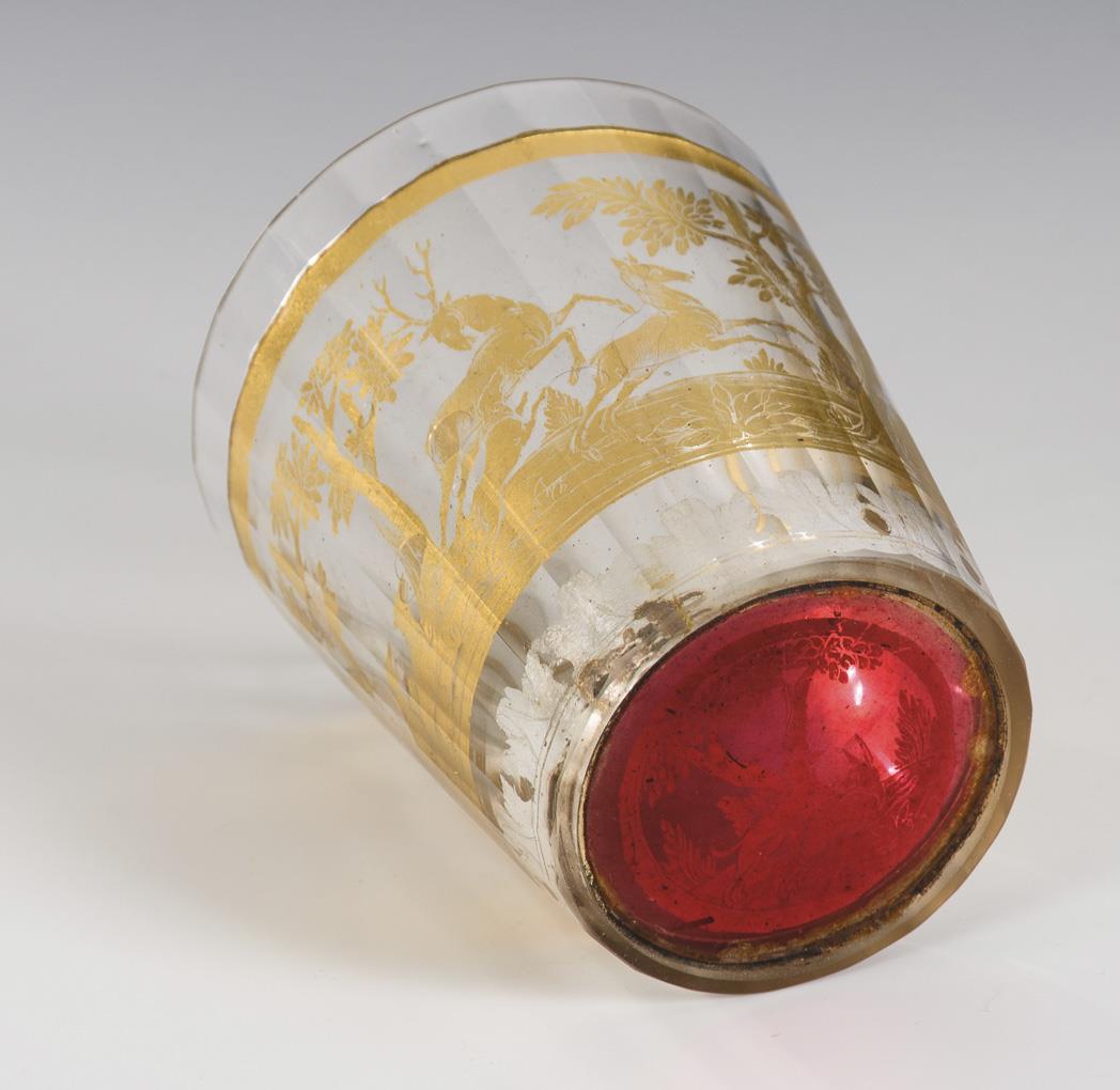 Konischer Becher mit facettierter Außenwandung. Oberhalb des Standes eine Akanthusblattbordüre in radierter Silberfolie. Umlaufend radierte Goldfolie mit der Darstellung von zwei Jägern zu Pferde, drei Hunden sowie Hirsch und Hirschkuh. Im Boden radierte Silberfolie mit Hase und Hund vor Rotgrund. Altersspuren zwischen den Wandungen.