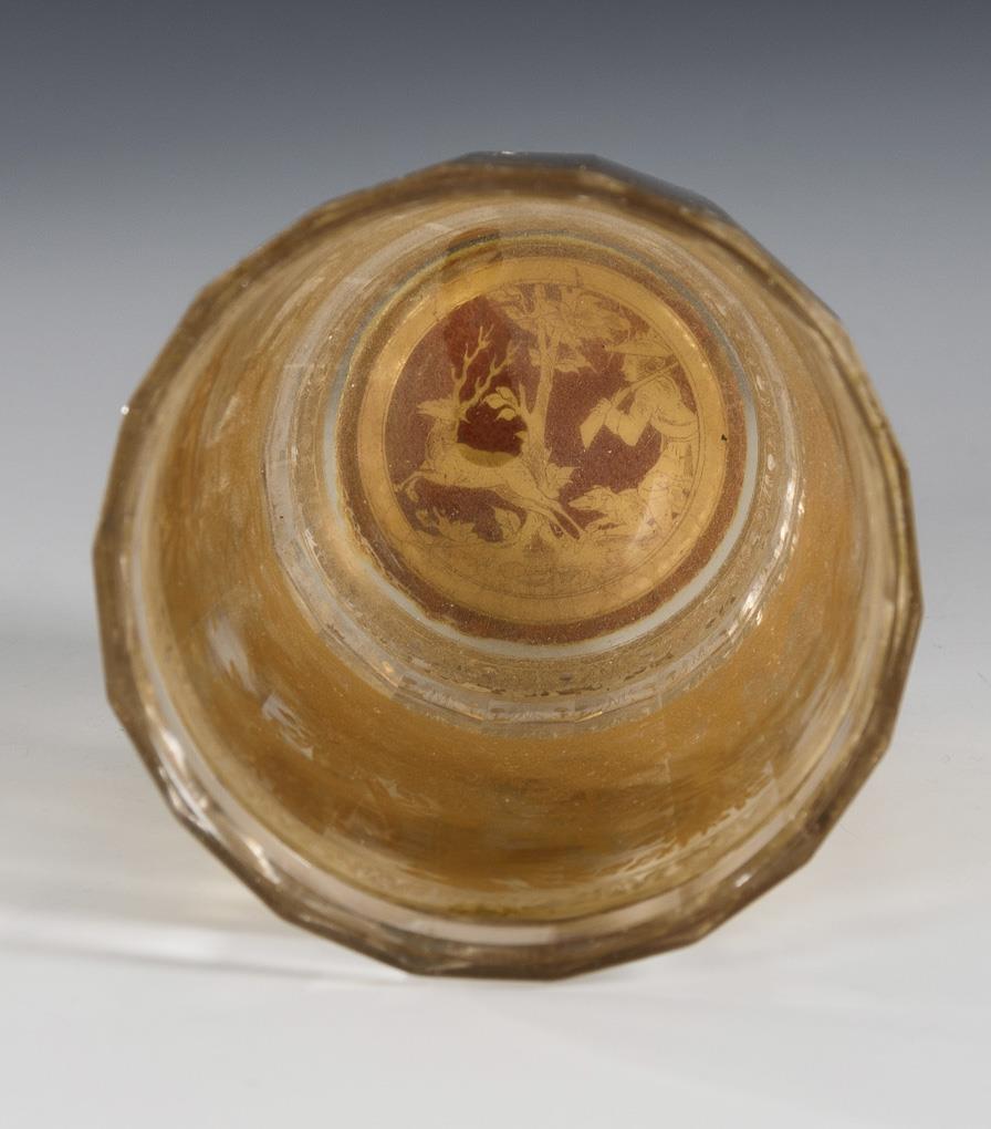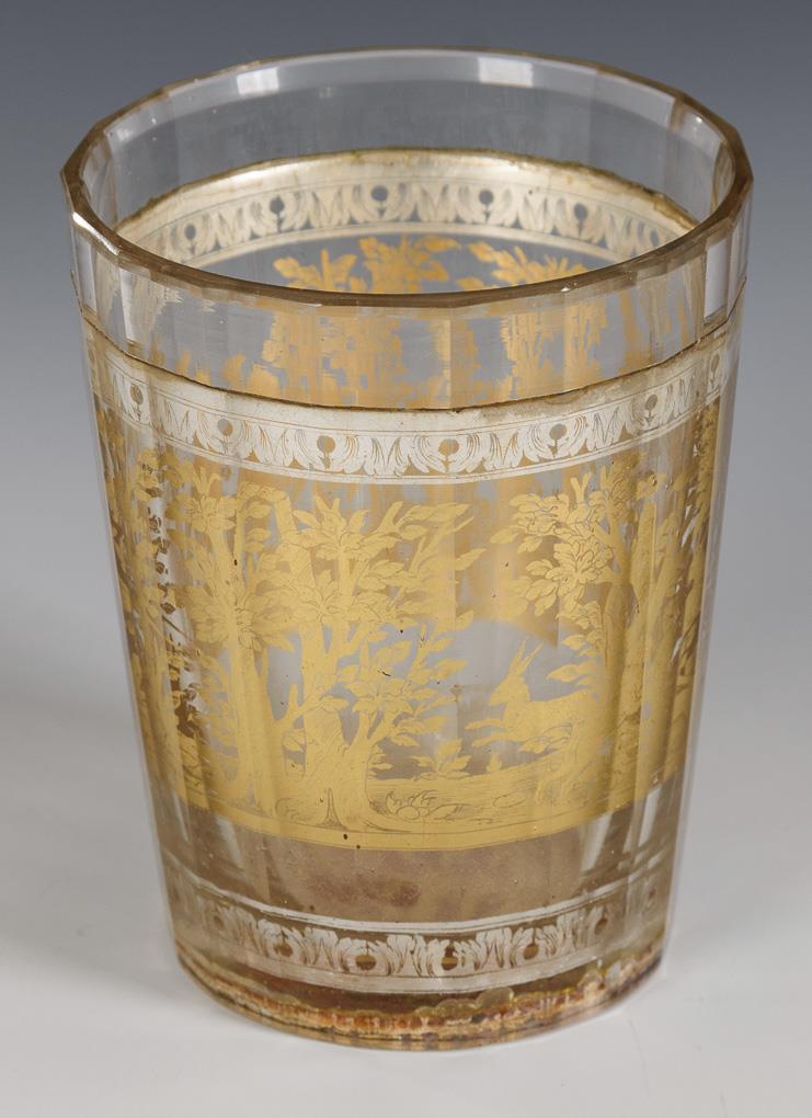 Konischer Becher mit facettierter Außenwandung. Zwischen Akanthusblattbordüren in radierter Silberfolie die umlaufende Darstellung einer Waldlandschaft mit zwei Hasen, Hunden und drei, teils berittenen Jägern. Im Boden ein Jäger und Hirsch in radierter Goldfolie vor Rotgrund. Minimaler Chip am Stand, vergilbte Leimspuren im Glas.
