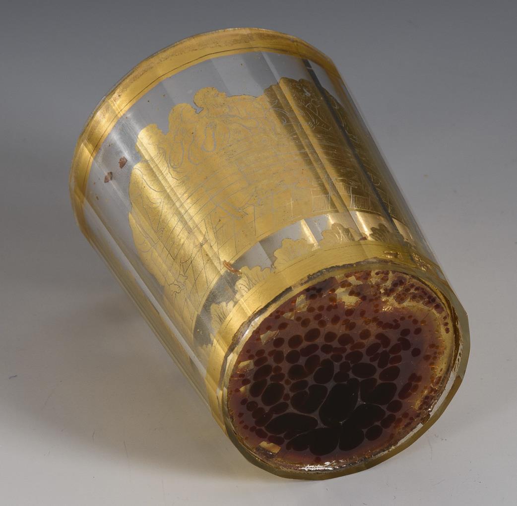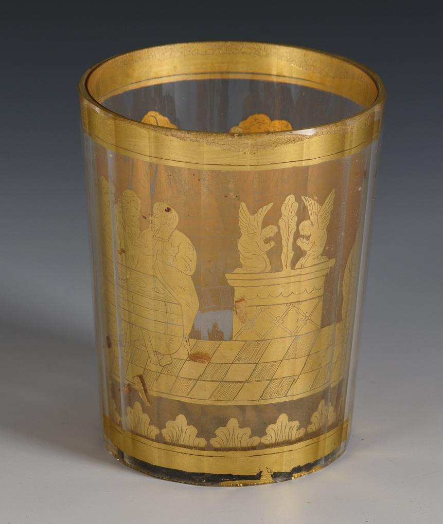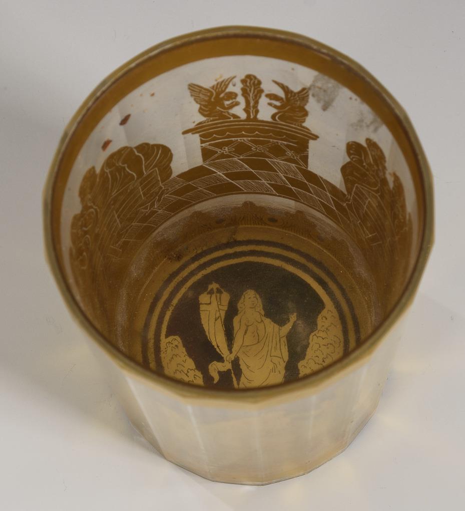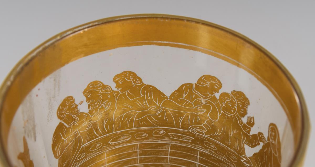 Konischer Becher mit facettierter Außenwandung. Umlaufend die Darstellung des Letzten Abendmahles in radierter Goldfolie. Im Boden der auferstandene Christus vor Rotfond. Minimaler Randchip (Ø ca. 1 mm), Boden locker, teils lose Rotbeizepartikel zwischen den Wandungen.