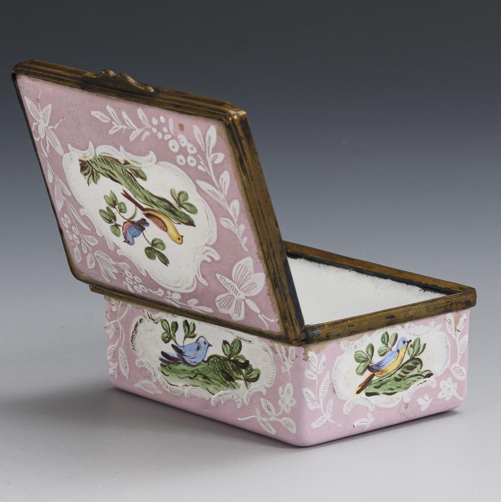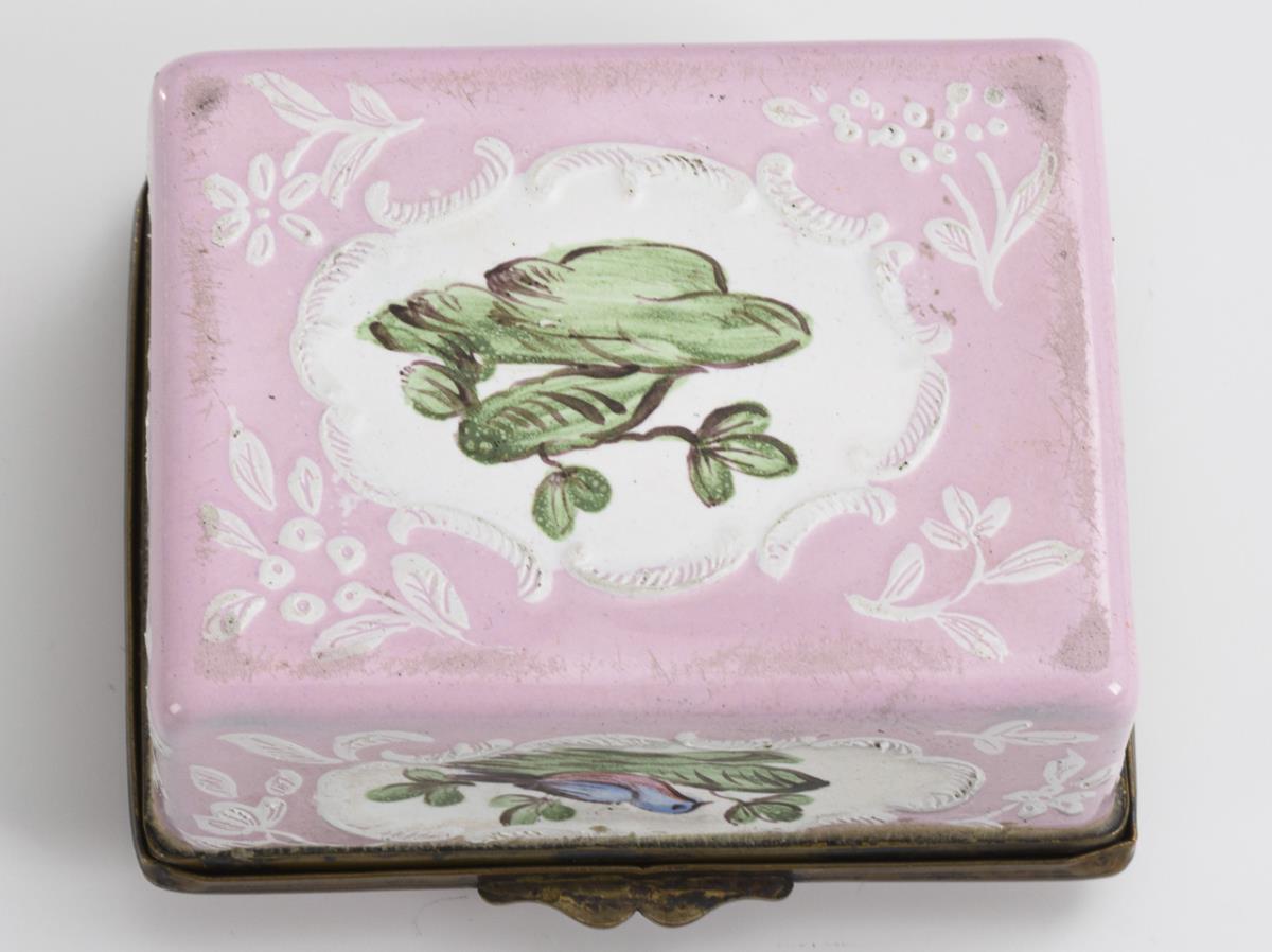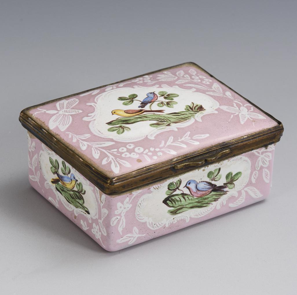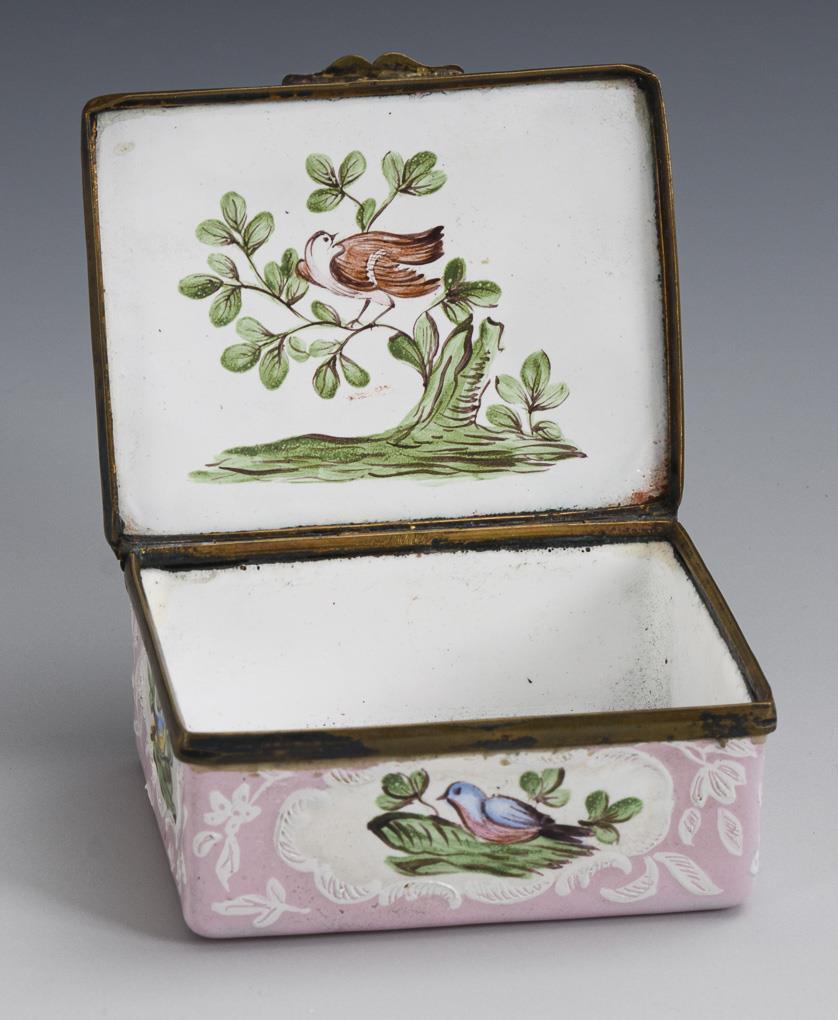 Quaderförmige Dose mit gering gewölbtem Scharnierdeckel. Auf dem Deckel und allen Seiten je Zweige mit Vögeln in Rocaille-Kartuschen; auf dem Boden ohne Vogel. Innen weiß; im Deckel ein Vogel auf einem Baum.
