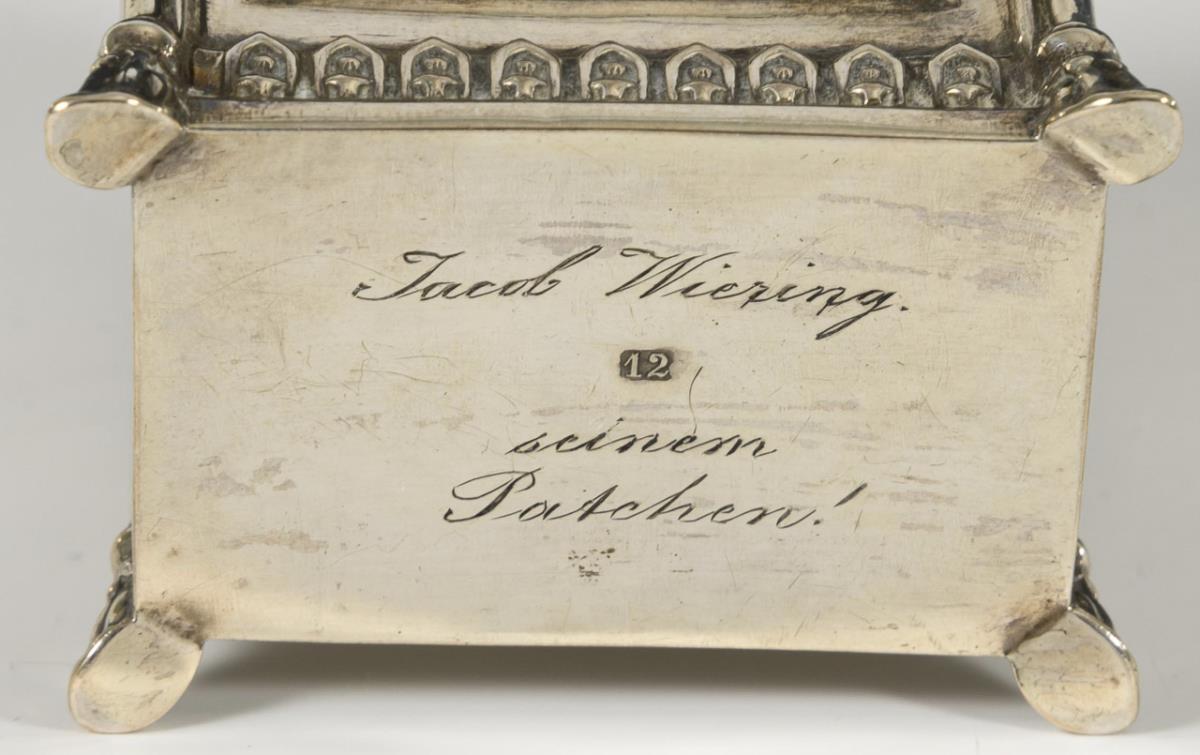 Reliefierte Dose in Tabernakelform. Unterseitige Gravur: "Jacob Wiering seinem Patchen!". 1 Schlüssel.