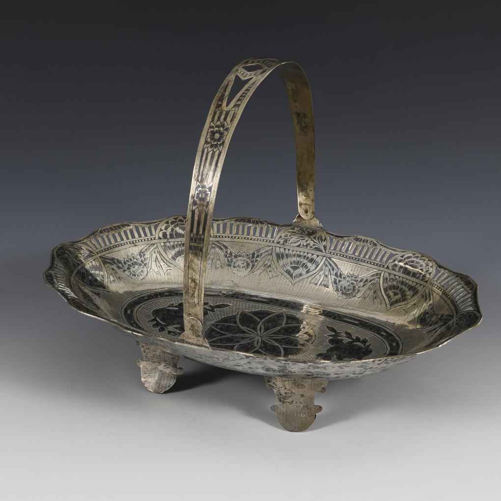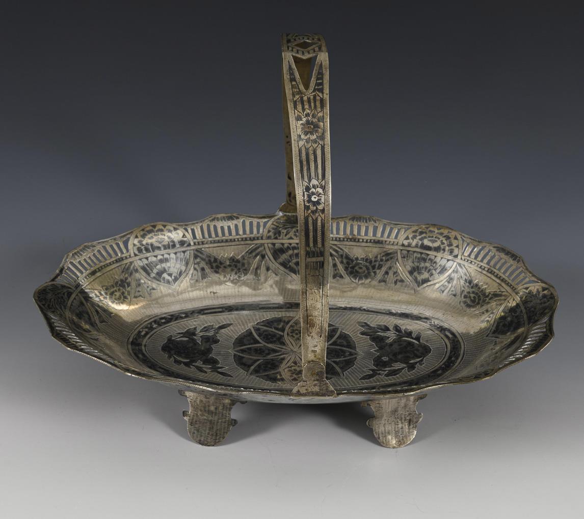Ovale Henkelschale mit Floraldekor in Niello-Technik. Gebrauchsspuren, kleine Randkerben, unterseitig sichtbare Lötnaht.