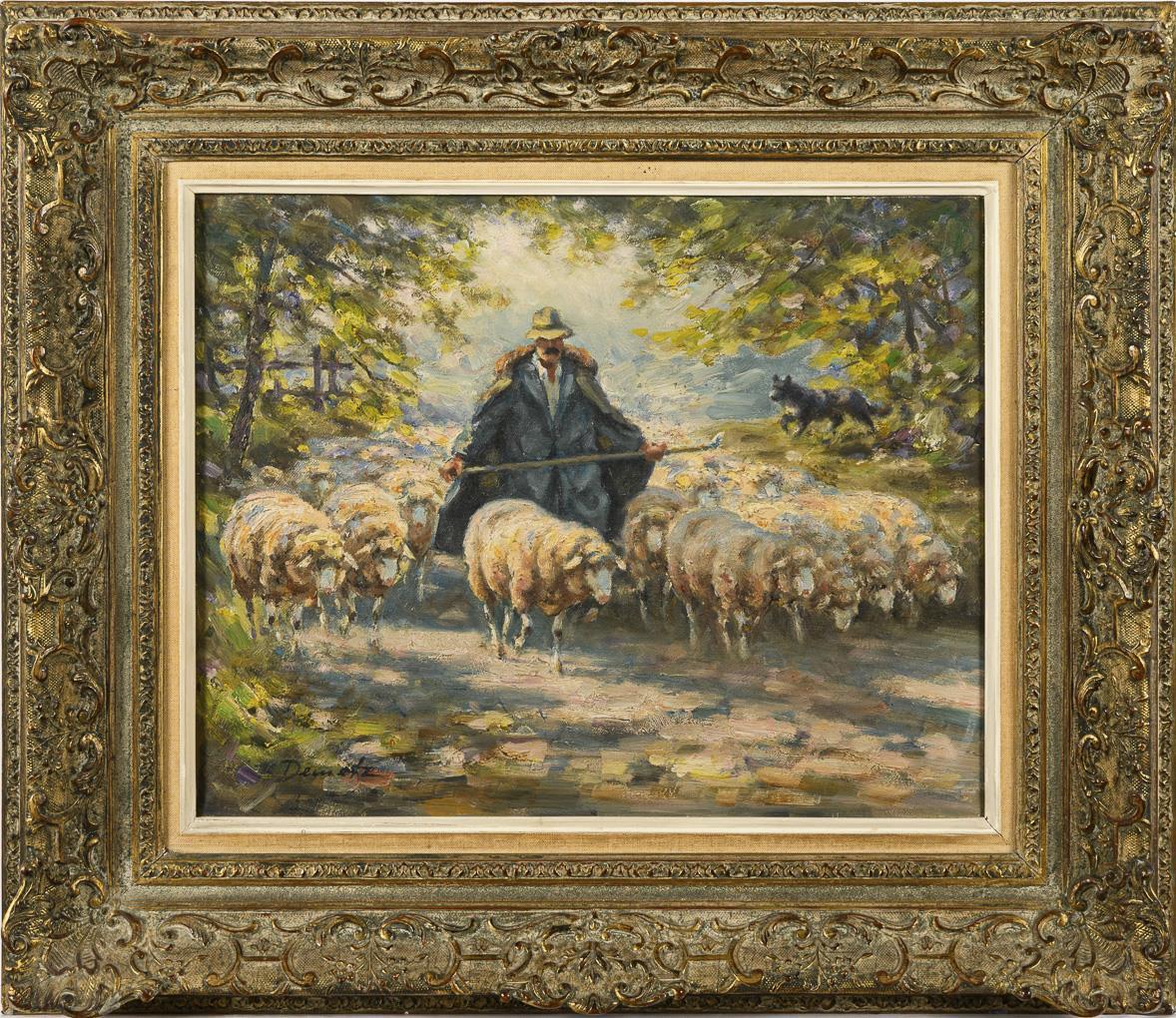 Der Schäfer mit der Herde auf einem Weg im Sonnenschein.