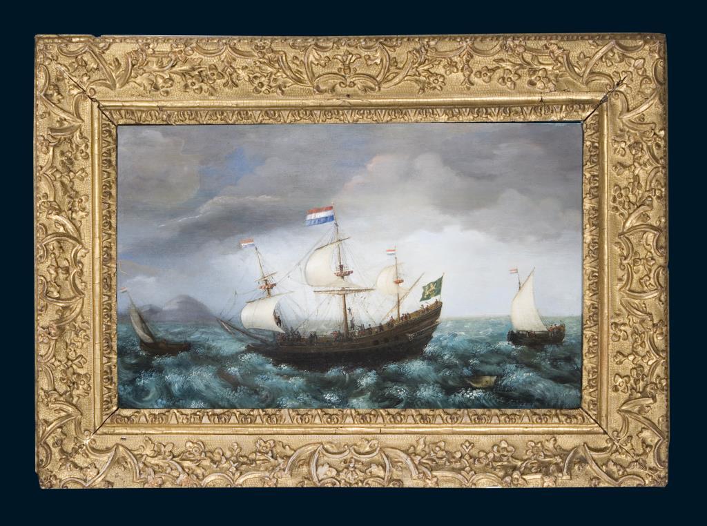 In den bewegten Wellen ist ein Wal am unteren Bildrand sichtbar. Geschnitzter Rahmen aus der Zeit, ehemals gold gefasst. Platte gewölbt.