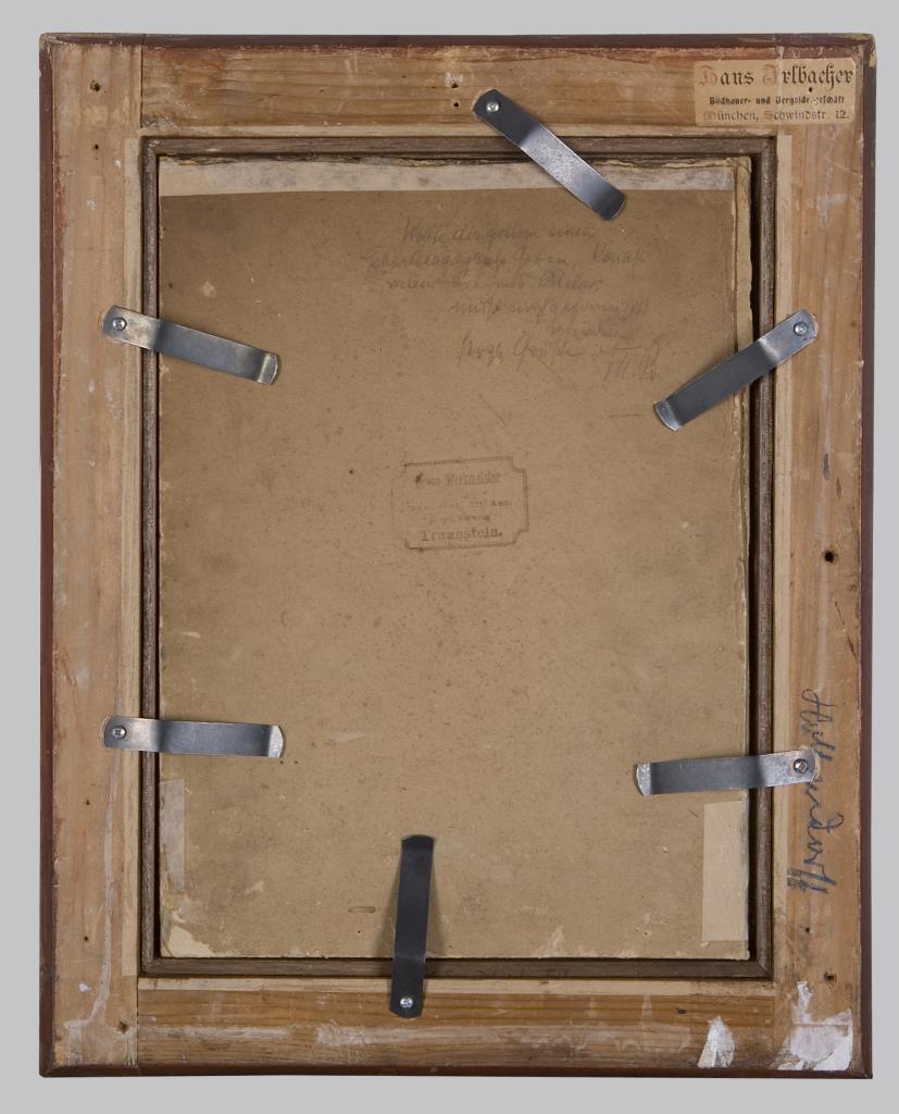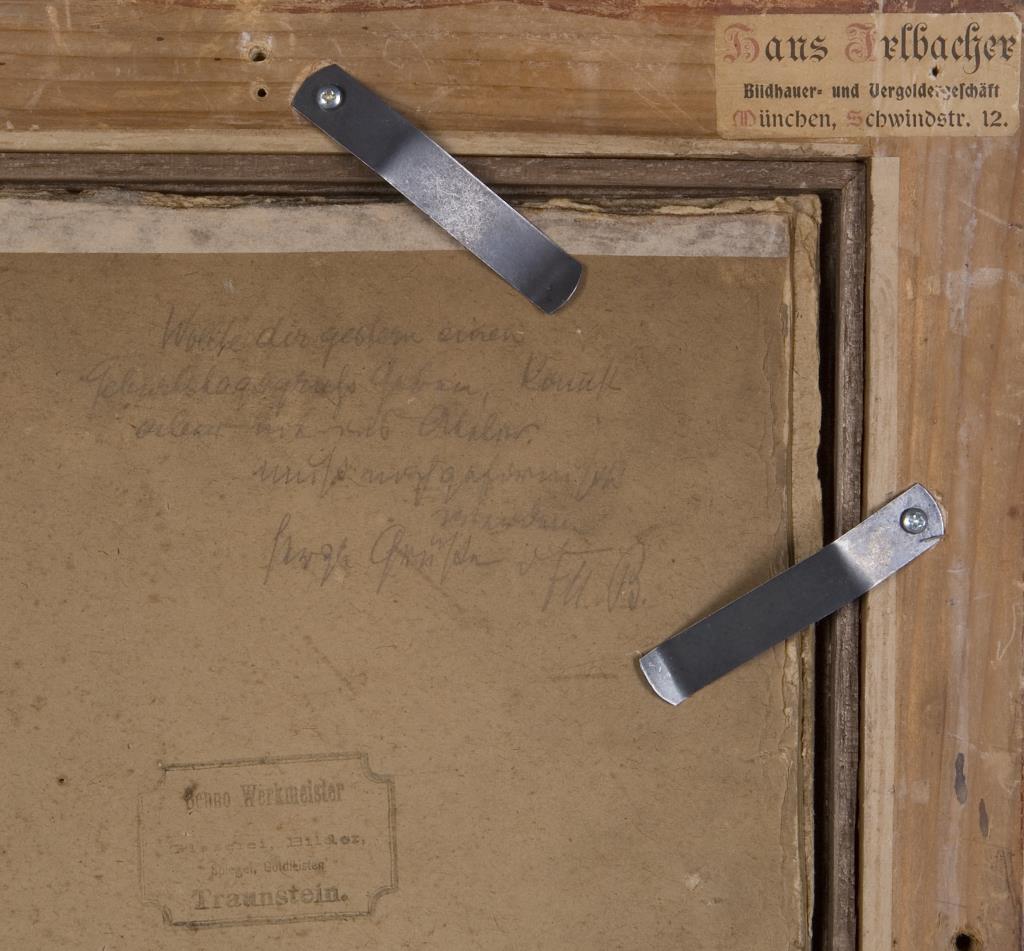 Rückseitig Widmung des Künstlers mit Monogramm. Goldrahmen mit altem Münchner Klebezettel. Vorstudie zu dem Hauptwerk von 1908 (57 x 96 cm, das Gemälde wurde im März 2016 für 51.000,- Euro versteigert). Im Hintergrund kleiner Farbabplatzer.