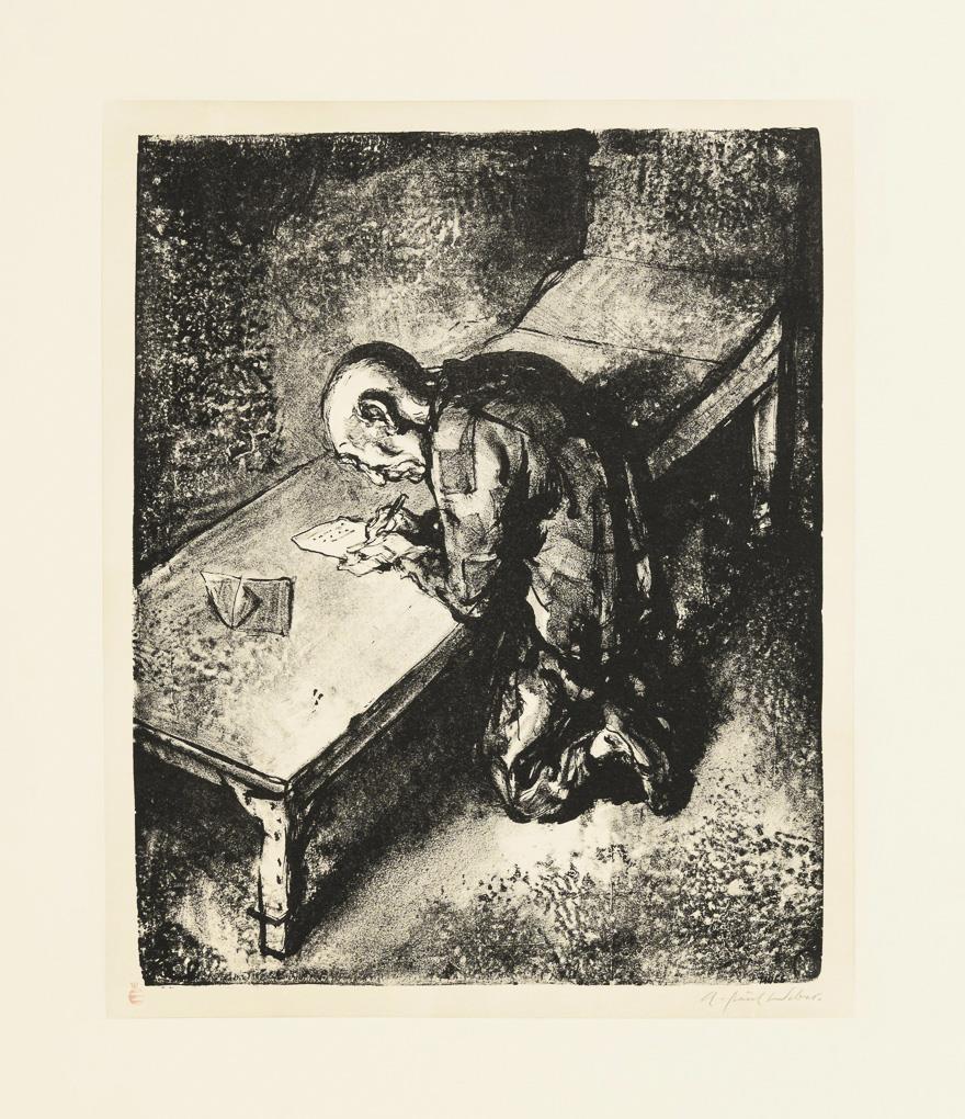 Aus der Reihe "Gefangene"- in Erinnerung an die Gestapo-Haft des Künstlers vom 1.7. bis 15.12.1937 im KZ Hamburg-Fuhlsbüttel, Berlin und im Nürnberger Polizeigefängnis. Minimal knickspurig.