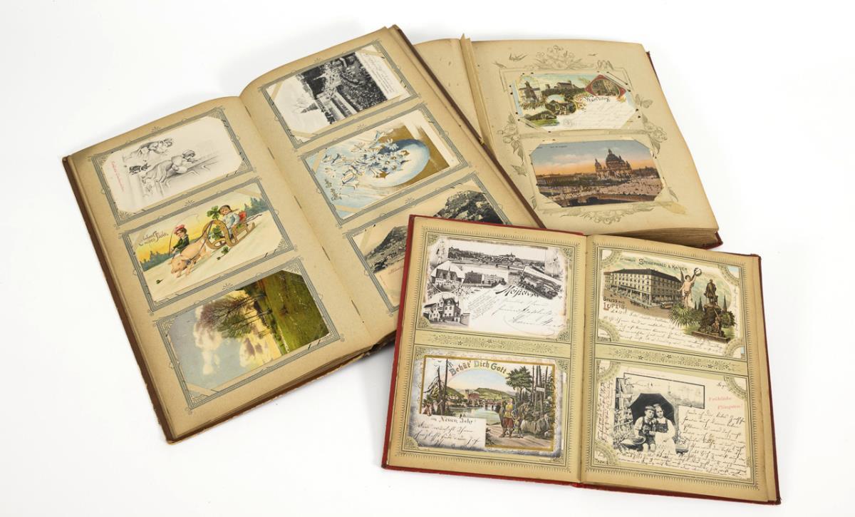 Vorwiegend um 1900-1910. Viele "Gruß aus ..." Karten, original gesteckt aus einem Haushalt. Zwei rote und ein braunes Album.