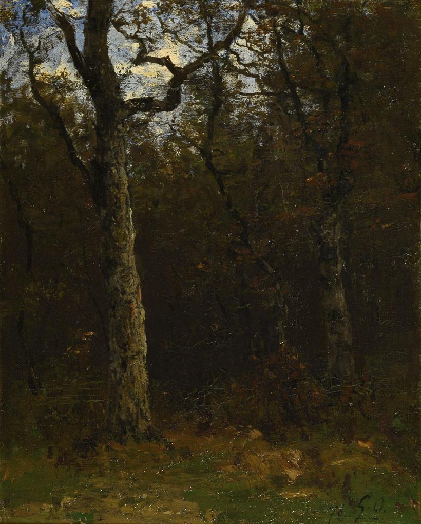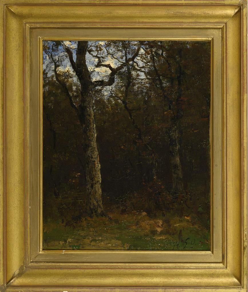 Impressionistisch gemaltes Waldinneres mit schlanken Bäumen und herbstlichem Laub. Leichte Altersspuren.