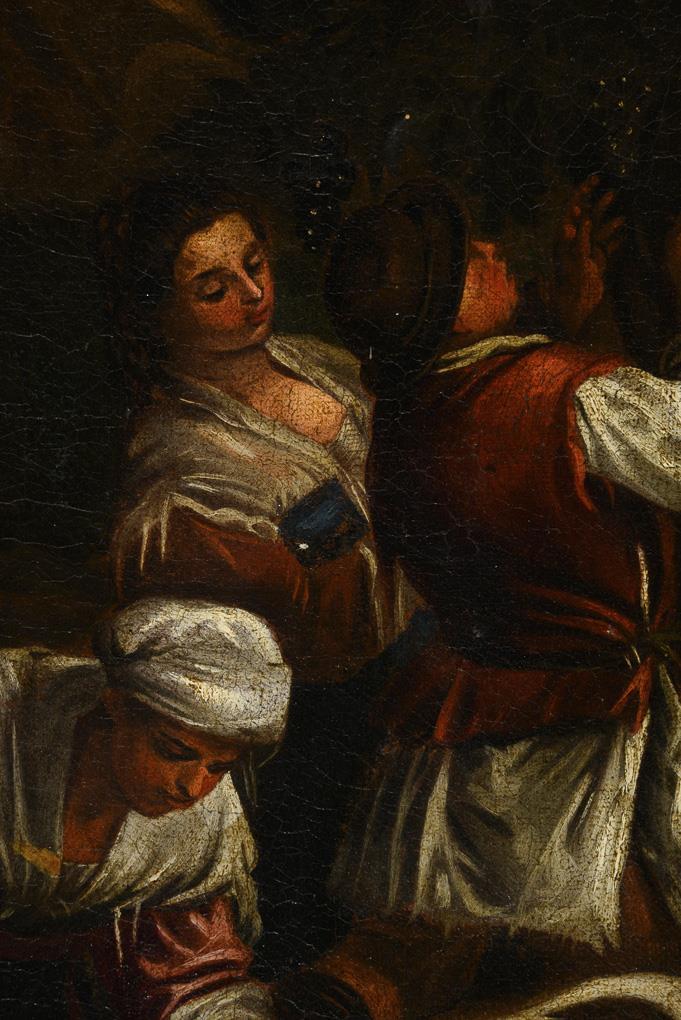 Vielfigurige Szene mit Bauernvolk beim Ernten und Verarbeiten der Trauben in bergiger Landschaft. Versteigert am 10. Juli 1976 im Auktionshaus Günther Husmann in Düsseldorf. Dort und in der "Weltkunst" alte Zuschreibung an Giacomo Bassano. Abgebildet in Weltkunst 1976, Nr. 12, 15. Juni 1976. Leinwand doubliert.
