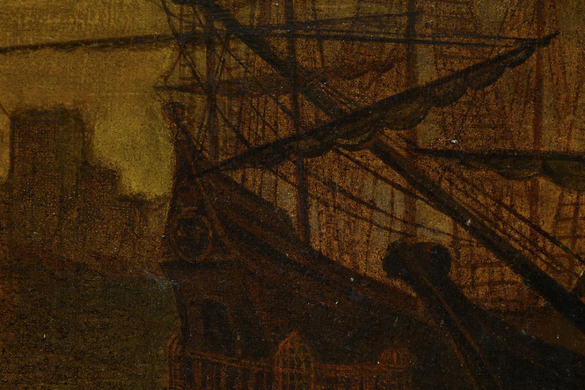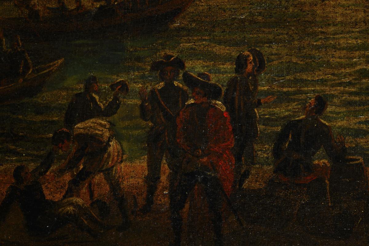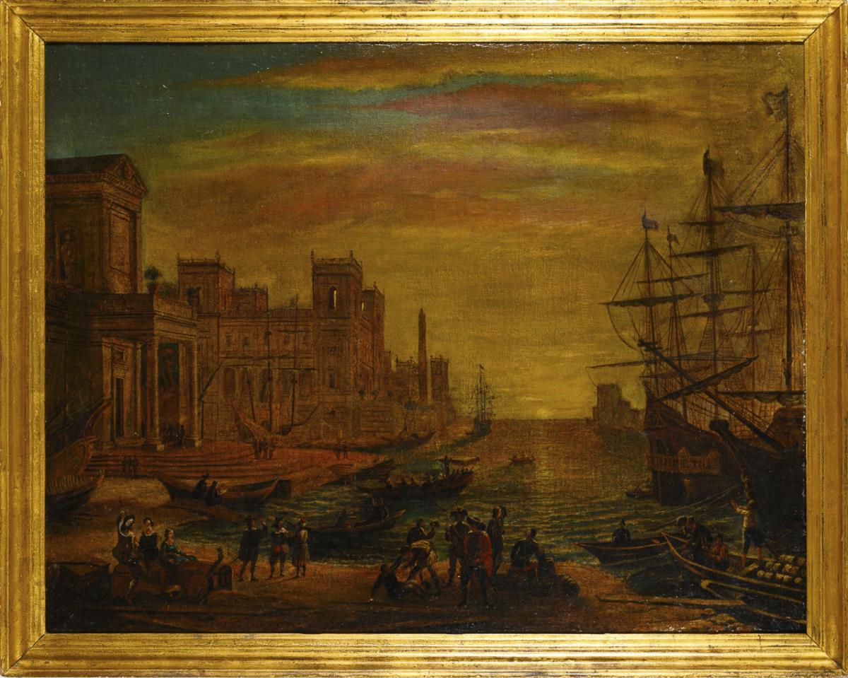 An die Hafenstücke Lorrains erinnernde Szene mit vielen Personen bei den Booten und Schiffen vor tief am Horizont stehender Sonne. Leinwand doubliert.
