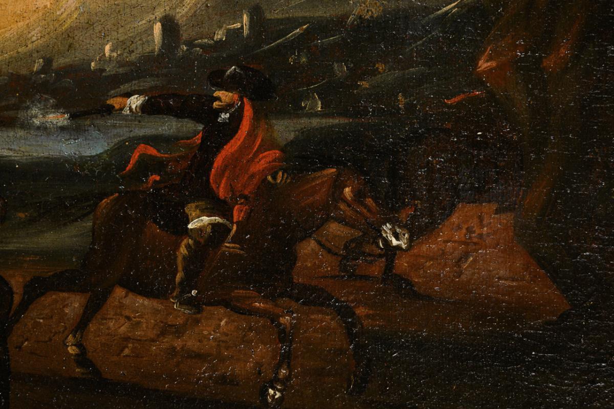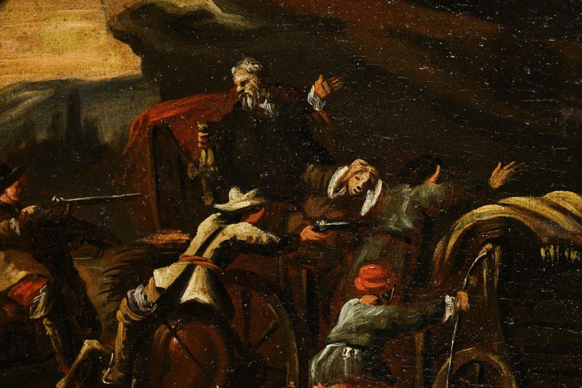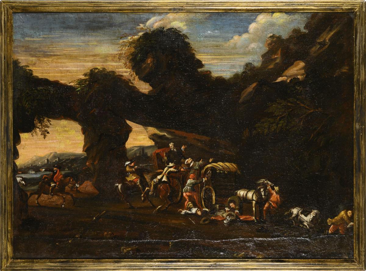 Genreszene mit berittenen Räubern, welche eine Kutsche im felsigen Gebirge überfallen. Leinwand doubliert.