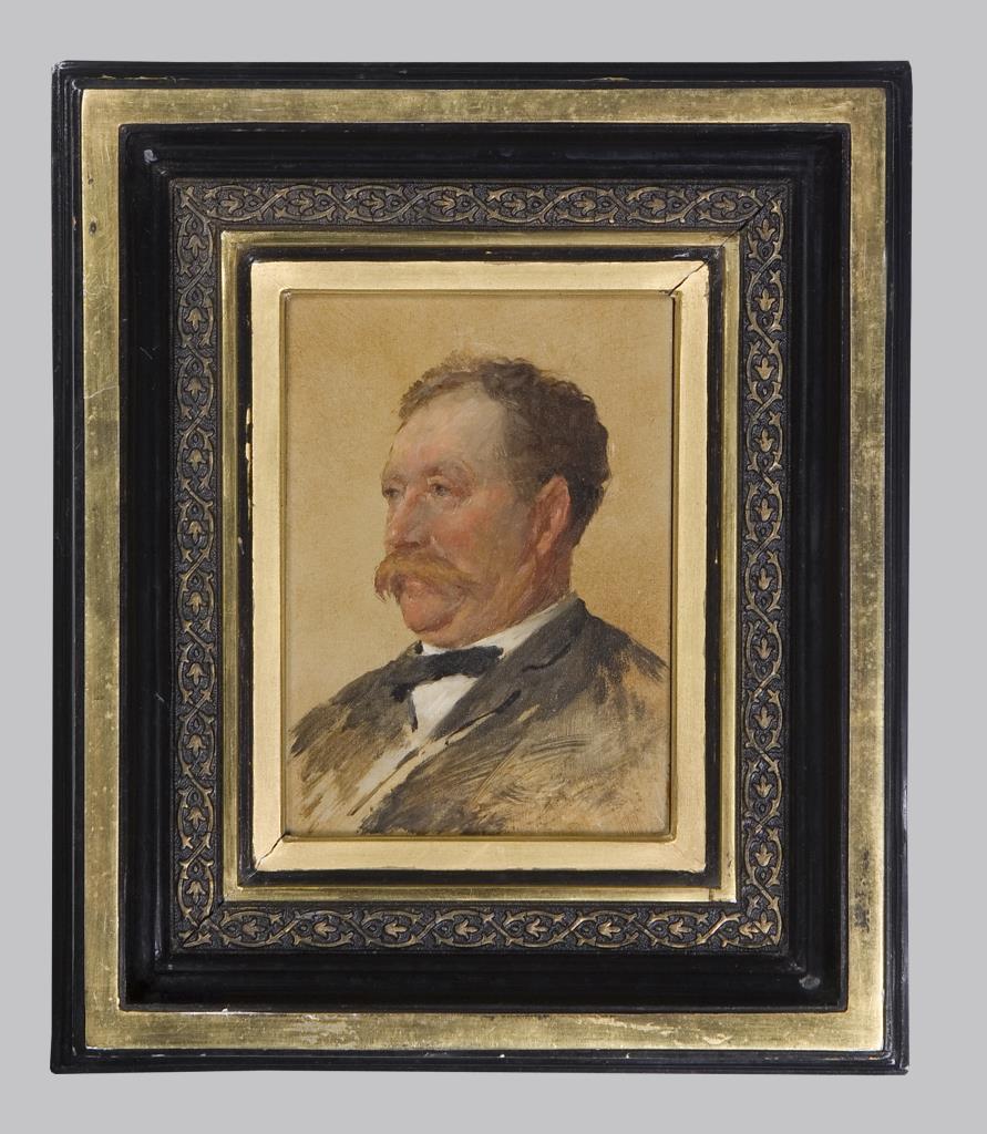 Rückseitig kyrillisch bezeichnet, alter nummerierter Klebezettel, Stempel, handschriftliche Sammlungsnummer. Breiter Profilrahmen, schwarz-gold gefasst. Rahmen partiell leicht defekt.