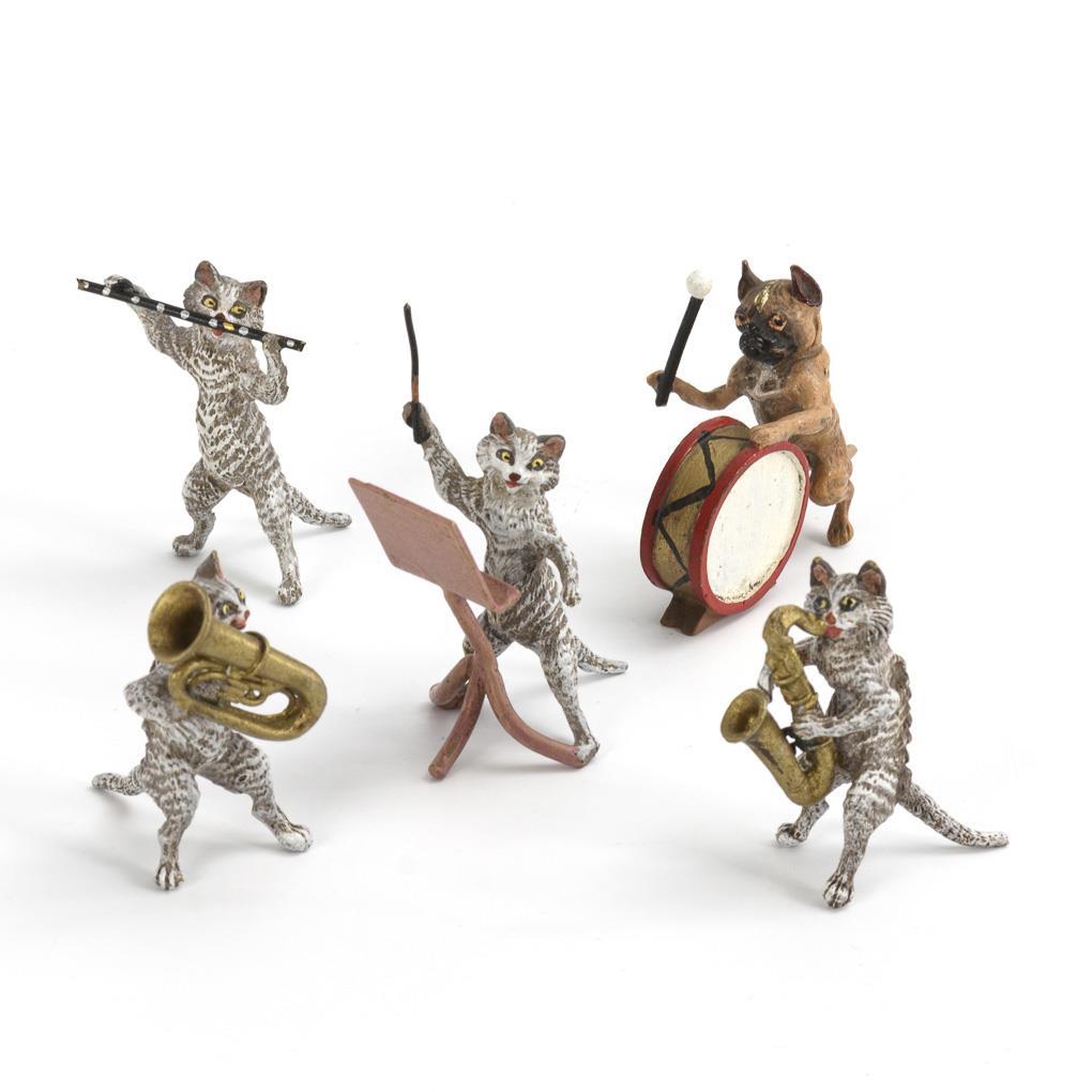 Katzenkapelle mit Dirigent und 3 Blasmusikern sowie ein Hund mit Pauke. Dirigentenstab verbogen.