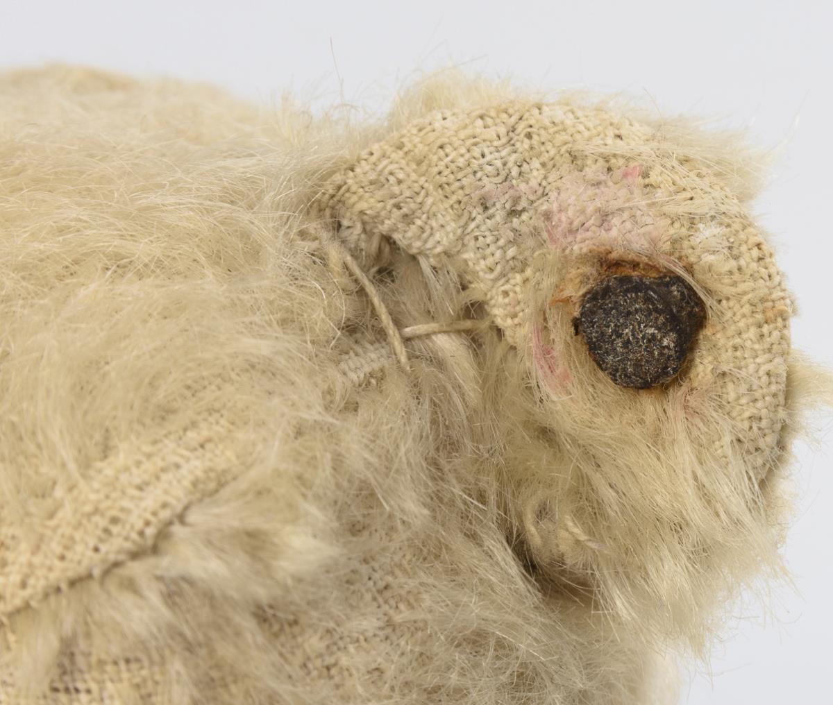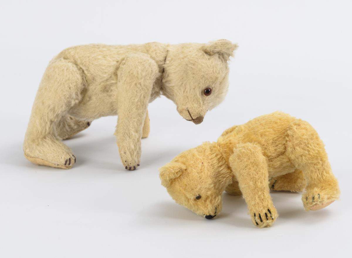 Weißer Teddy mit Knopf und Fähnchenrest (wohl Nr. 5325,2). Filze ergänzt, Krallen nachgestickt (L 25 cm). / Kleiner goldblonder Teddy mit rosa Filzsohlen (L 18 cm). Minimale Altersspuren, Druckstimmen verstummt.