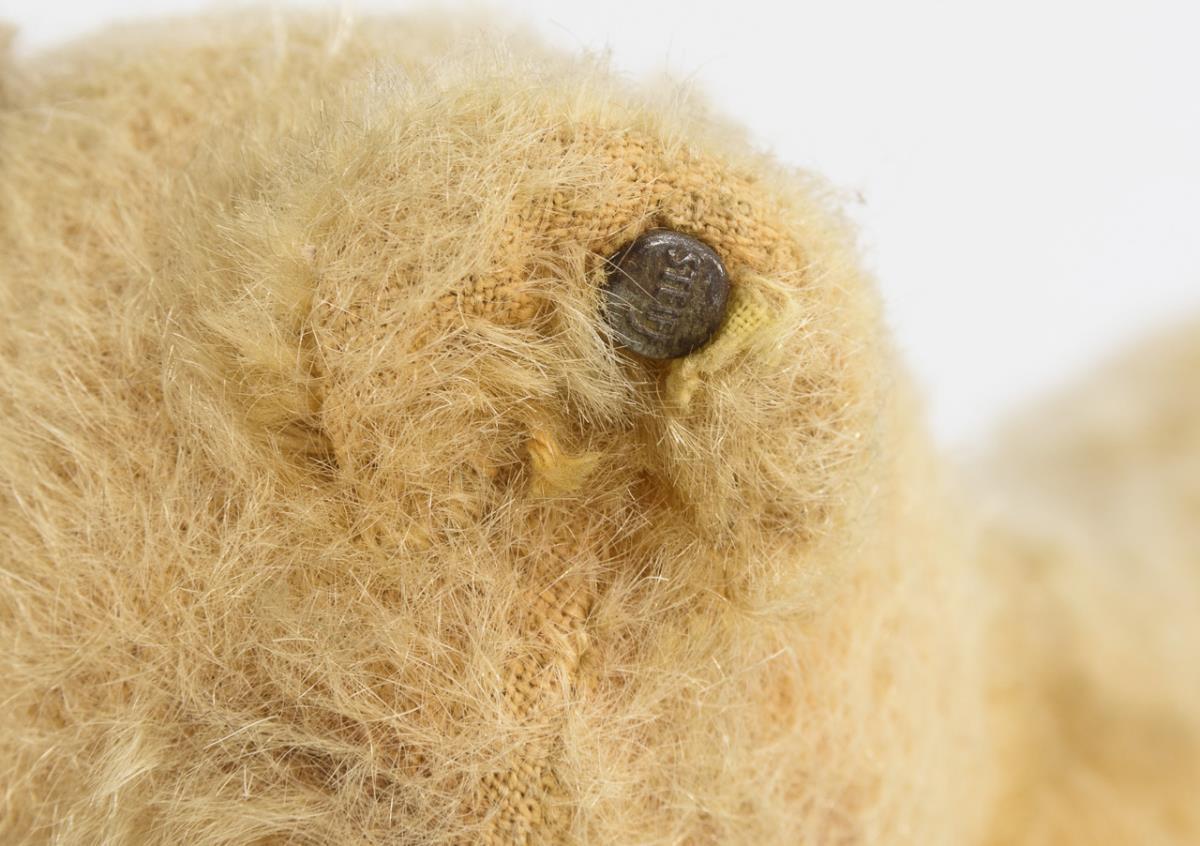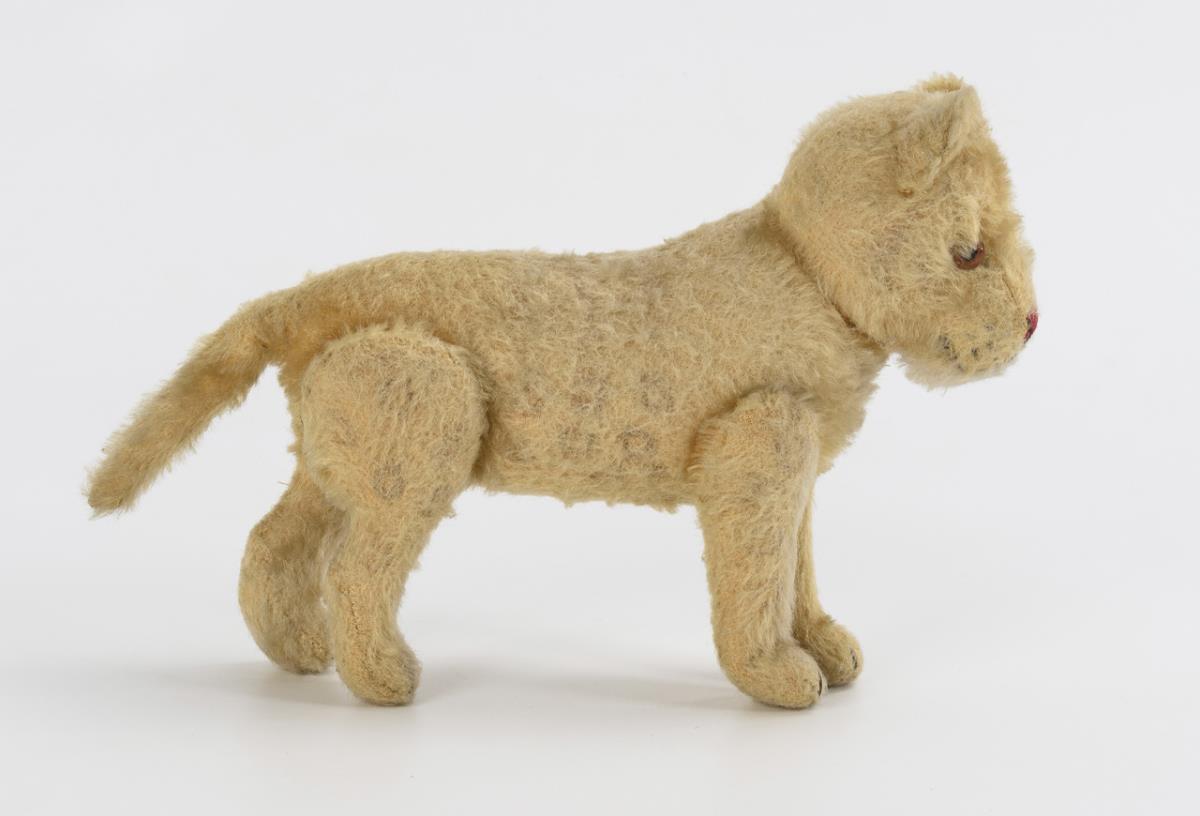 Gelbbraune Löwin mit drehbarem Kopf, Glasaugen, rot bestickter Nase und beweglichen Gliedern. Leichte Altersspuren, Druckstimme verstummt.