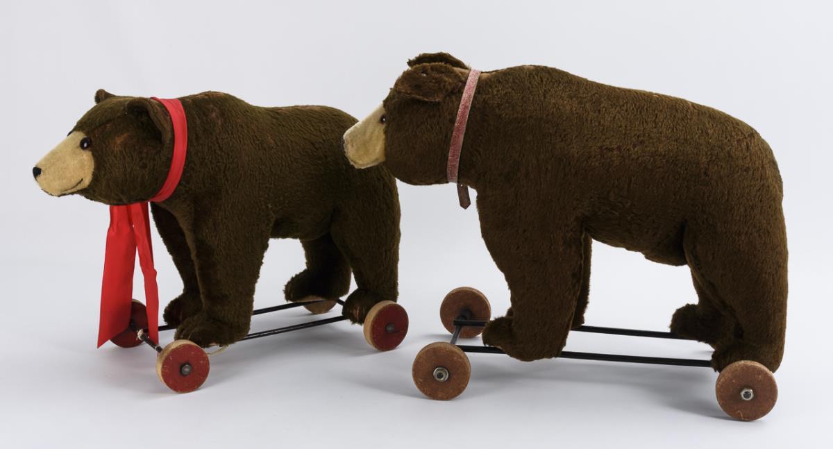 2 Reitbären mit intakter Zugstimme: Reitbär Nr. 1350,2, (Knopf im Ohr, mit heruntergezogenem 'f') mit originalem Lederhalsband. H ca. 47 cm. Kleinerer Reitbär Nr. 1344,2. H ca. 42 cm. Beide mit Fellverlust an Kopf und Rücken, 1x defekte Fußsohlen und ergänzte Räder aus Holzwerkstoff.