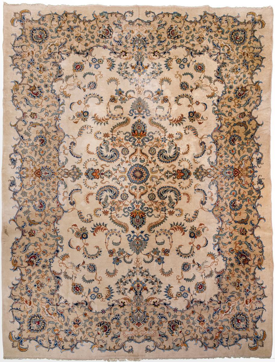Wolle und Baumwolle, handgeknüpft. Vorwiegend Cremefarben und Blau mit dezentem Farbspiel. Ca. 419 x 315 cm.