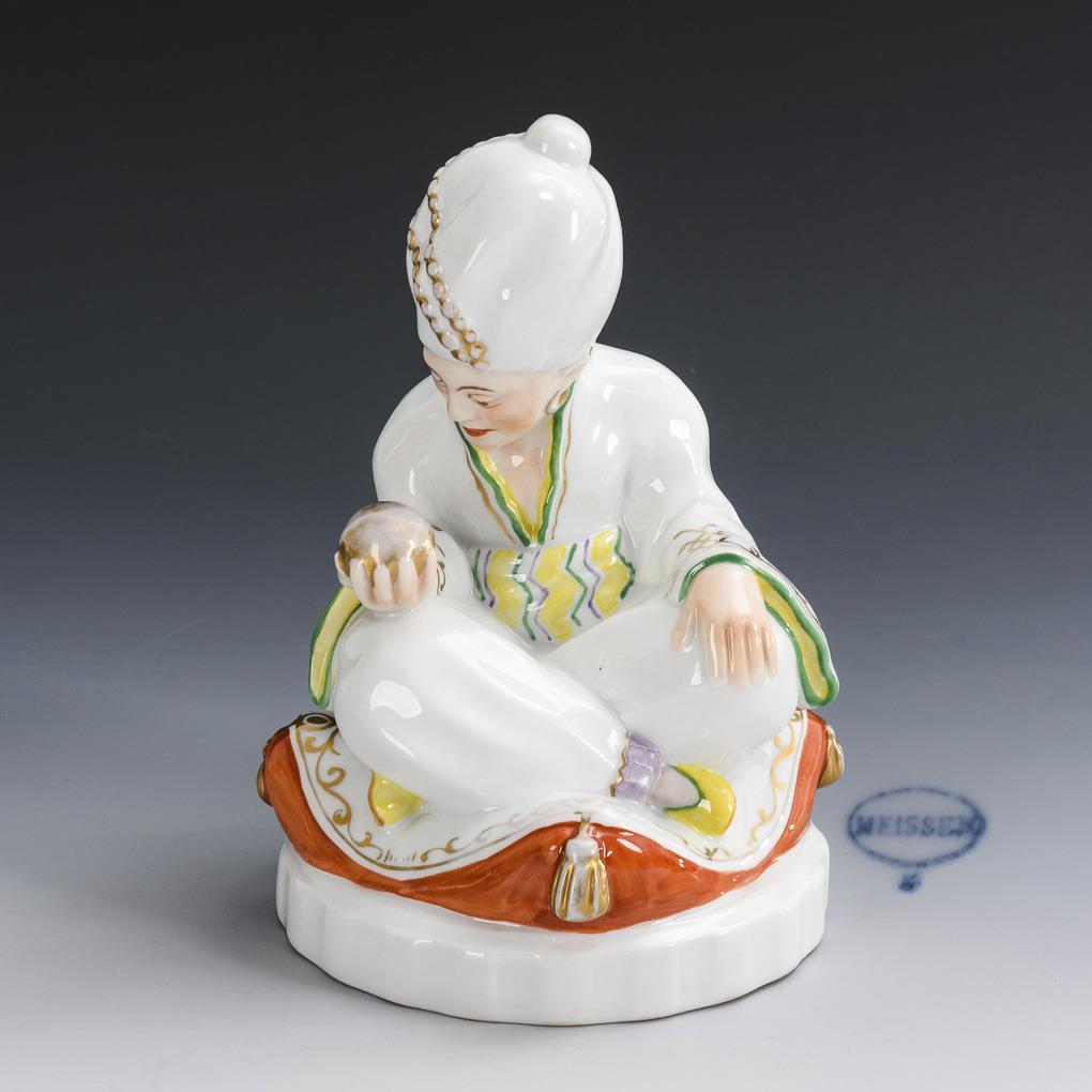 Auf einem mit Troddeln behangenen Prunkkissen mit überschlagenen Beinen sitzender, orientalisch gekleideter Mann mit Turban, eine goldene Kugel in seiner Hand betrachtend. Gold berieben.