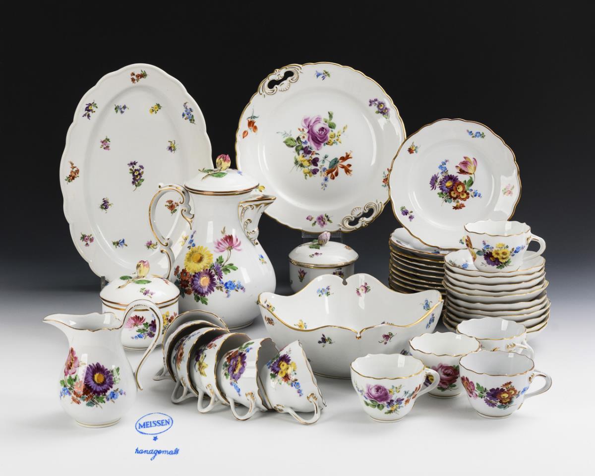 41 Teile. Form "Neuer Ausschnitt". Bemalt mit Blumenbuketts, 3x mit Streublümchen. Kaffeekanne (H 24 cm), Milchkännchen, 2 Zuckerdosen, 11 Tassen, 11 Untertassen, 12 Frühstücksteller, 1 Ovalplatte (L 34,5 cm), 1 Quadratschüssel (20,5 x 20,5 cm) und 1 Kredenzteller (Ø 27,5 cm). Haarriss im Milchkännchen, Chip am Kannenrand und 1 Tassenrand, 2 Rosenknäufe minimal bestoßen, 1 Tasse mit Haarriss und Bestoßung.