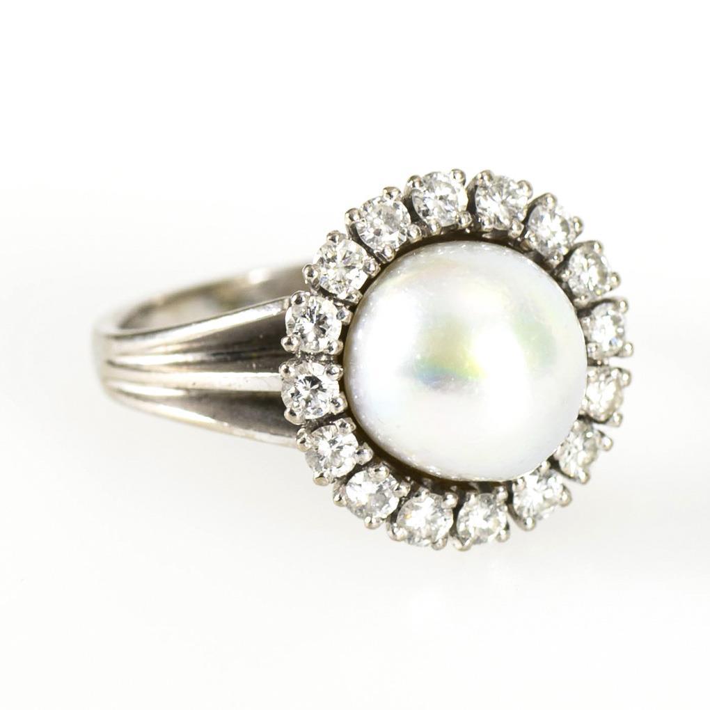 Weißgold 750 gestempelt. Perle Ø ca. 10 mm. Brillanten zus. ca. 0,52 ct. Ringgröße 51. 9,5 g.