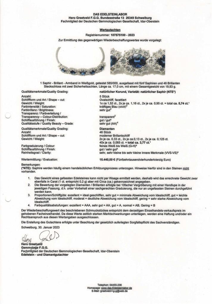 Weißgold 585 geprüft. Saphire zus. ca. 5,74 ct/kräftiges Blau. Brillanten zus. ca. 3,77 ct/G-H/vvs-vs. 19,8 g.