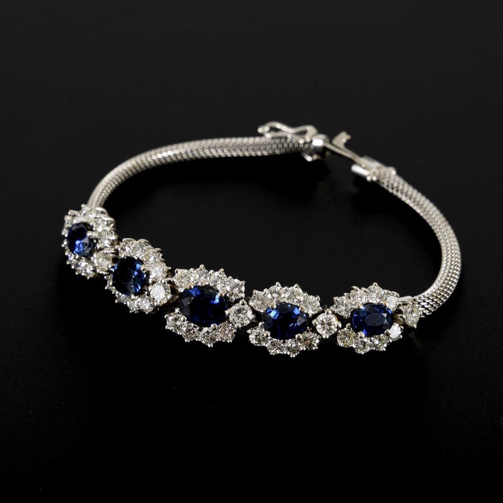 5 Saphire, umgeben von 46 Brillanten, zwischen Schlangenkettenband an Kastenschloss mit 2 Achtersicherungen.