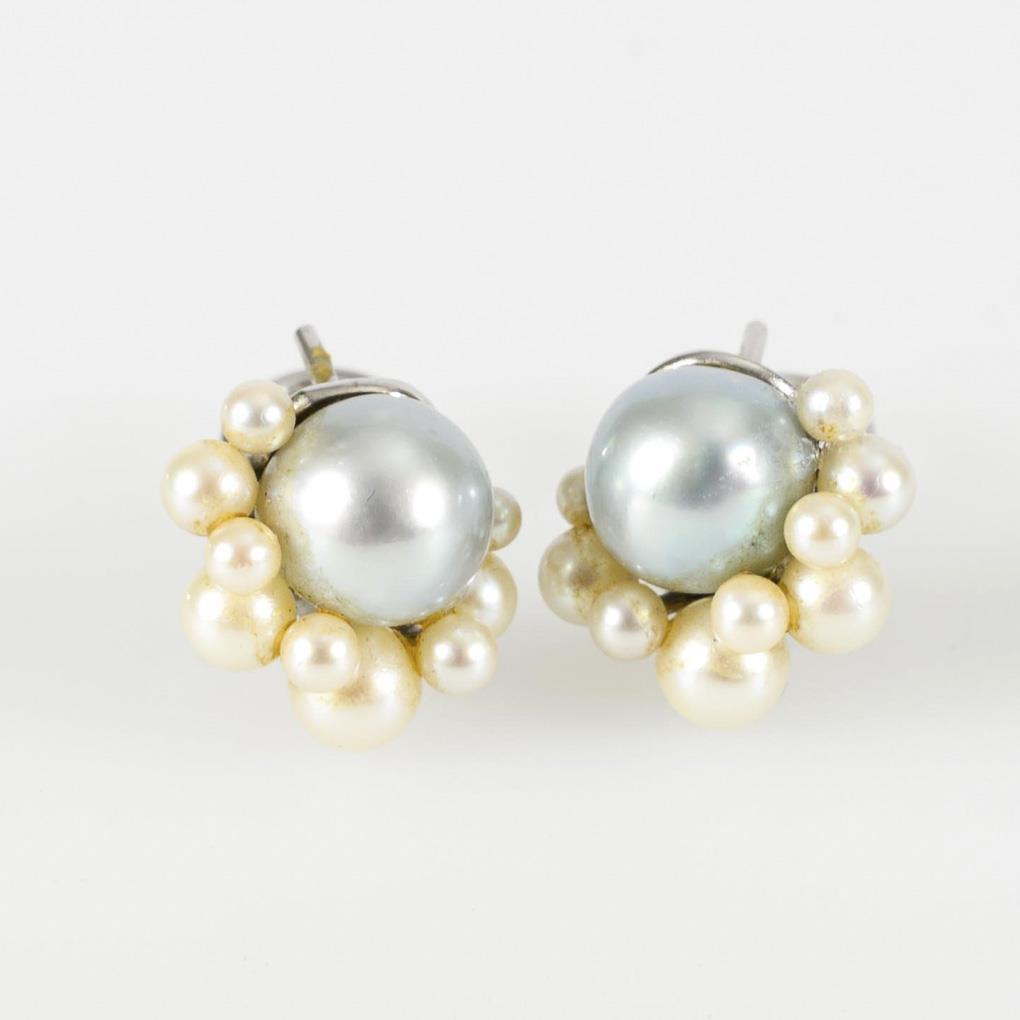 Barockperle, umringt von je 9 kleineren Zuchtperlen, an Steck/Klippmechanik.