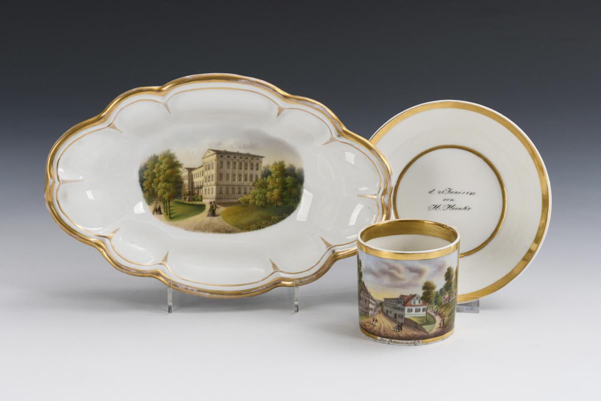 1x ungemarkt, um 1840.: Zylindertasse mit Ohrenhenkel und der schauseitigen Ansicht eines Straßenzuges, bezeichnet "Basenmühle" (sic!), im Spiegel der Untertasse die Widmung "d. 28 juni 1841. von H. Heinke". / 1x GOTHA, um 1883: Ovalschale, im Spiegel die Ansicht des Hotel Müller - Sanatorim Charlotte in Bad Liebenstein. Schalengold berieben.