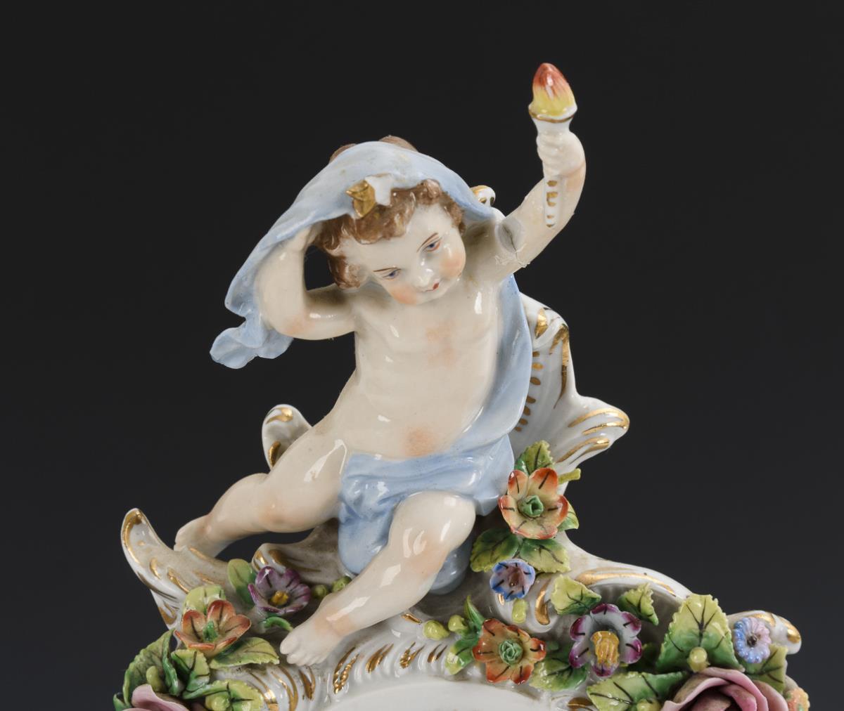 Rocaillegehäuse mit reichem Blütenbelag, vier Tageszeitenfiguren und Blumendekor, auf blütenbelegtem Sockel. Stern der "Nacht" bestoßen, Bestoßungen am Belag, 1 Arm geklebt.