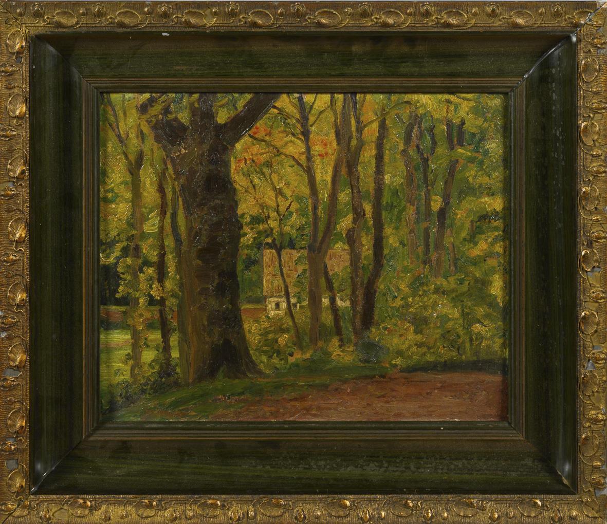 Blick durch die Bäume am Wegesrand zu einem Haus.