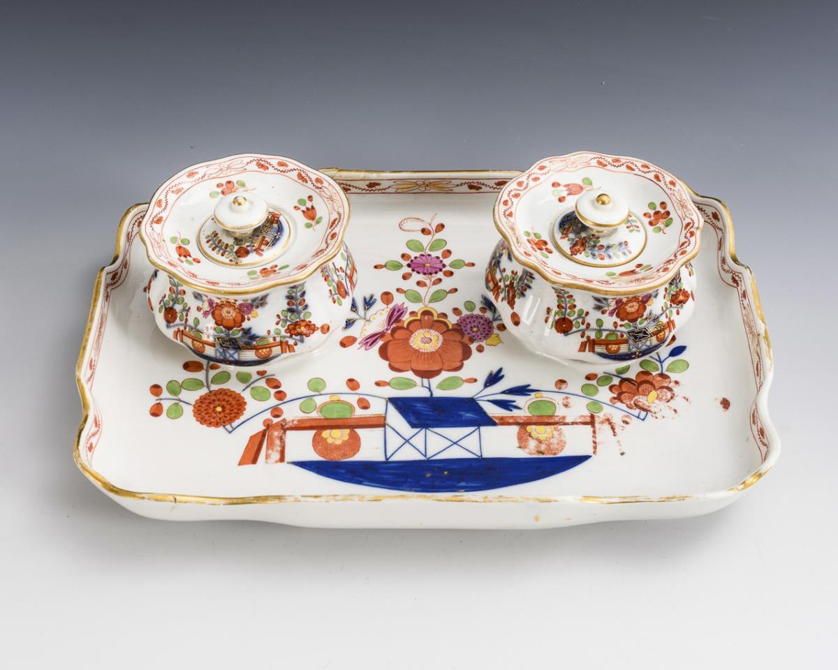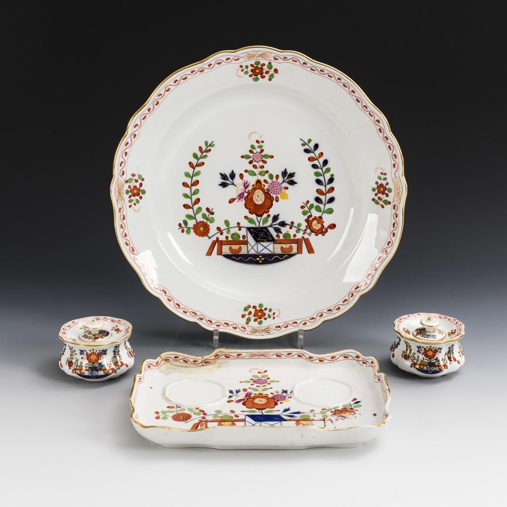 Form "Neuer Ausschnitt". Schreibschale (H 18,5 x 27,5 cm) mit zwei Tintenfässern (H 6,5 cm) und Gemüseteller (Ø 35 cm). Schreibschale berieben und mit geklebtem Randausbruch, kleine Bestoßung am Innenrand eines Tintenfasses, Gold partiell berieben.