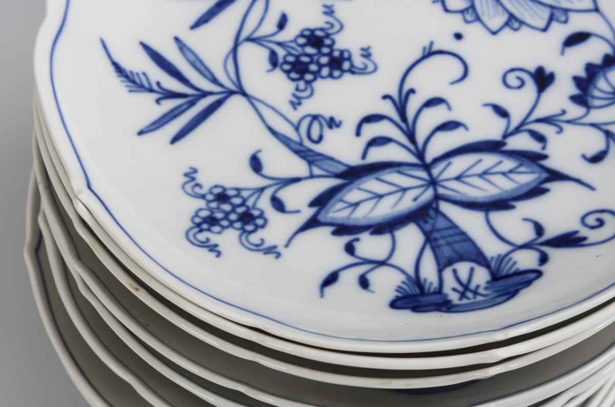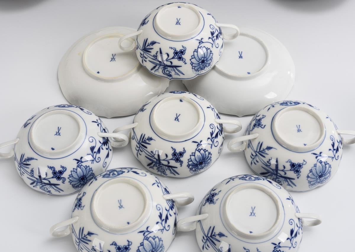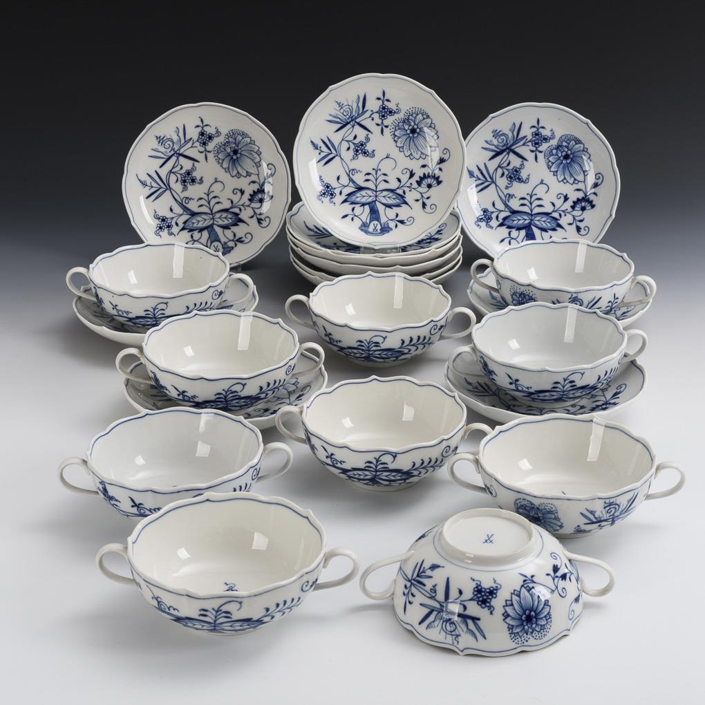 10 Zwiebelmuster-Suppentassen und 12 -Untertassen. Meissen.