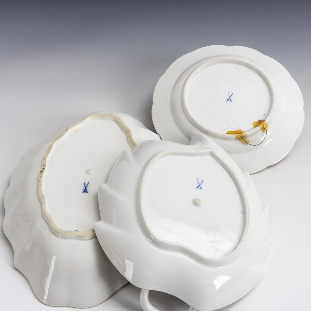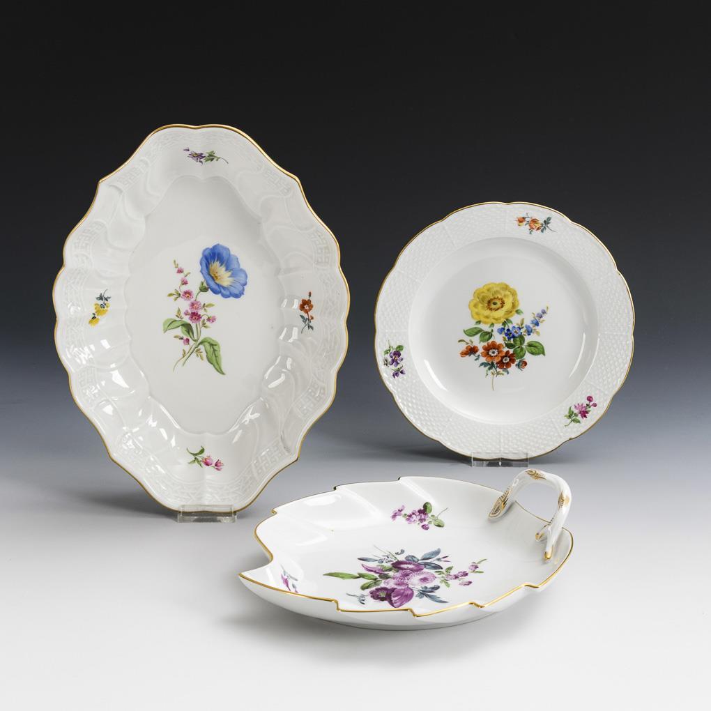 Blattschale, Schale und Teller mit Blumenmalerei. Meissen.