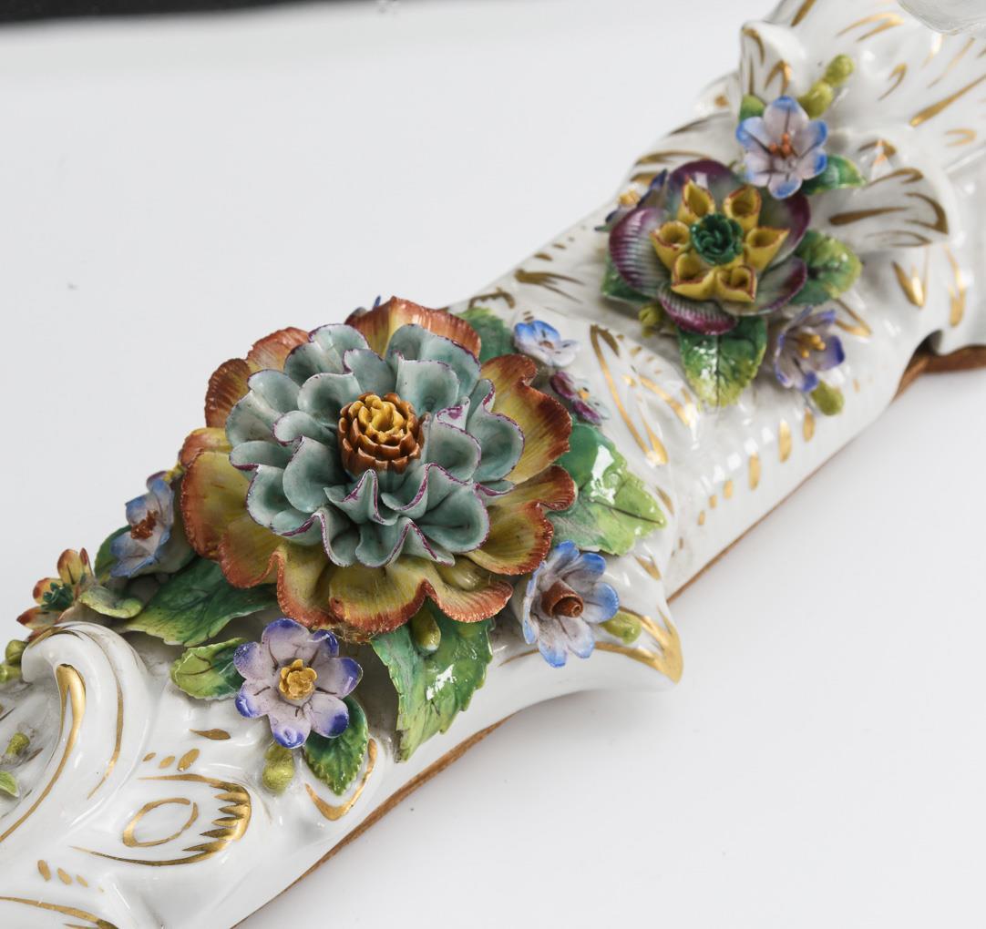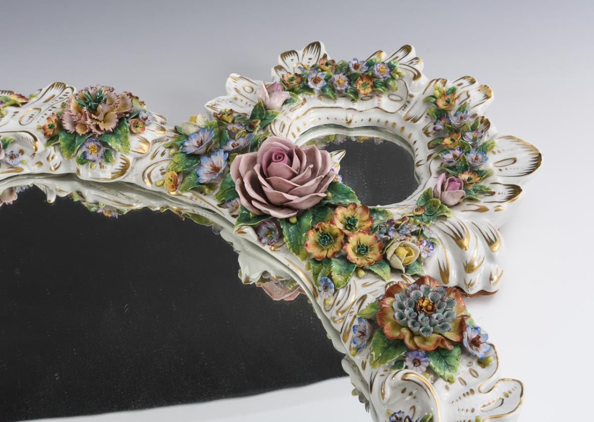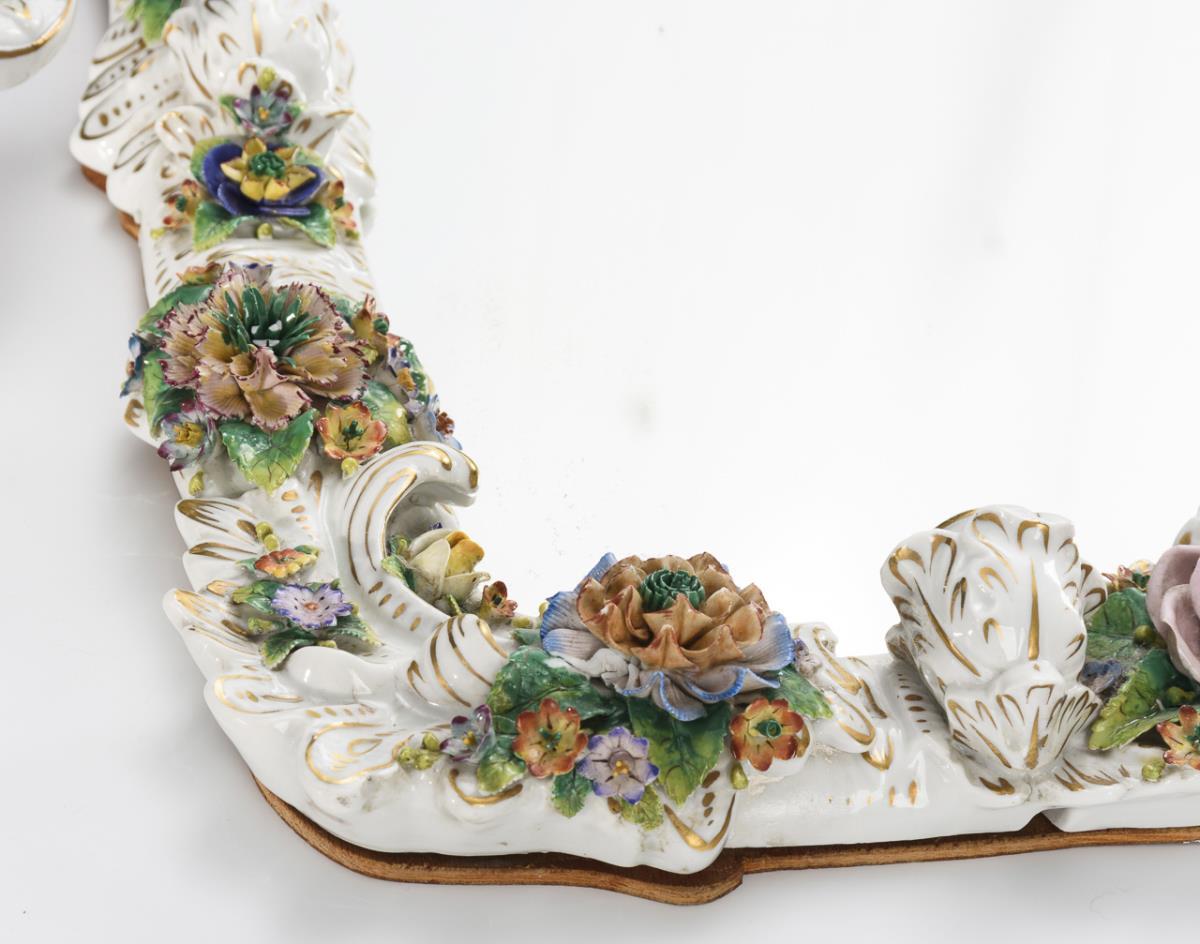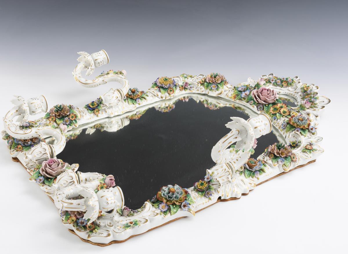 Porzellanspiegel mit Blütenbelag und 4 Leuchterarmen. Sitzendorf.
