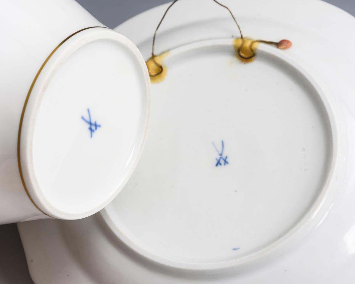 Deckelvase und Teller mit kupfergrüner Malerei. Meissen.