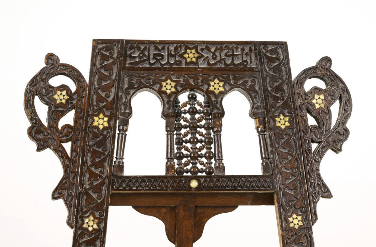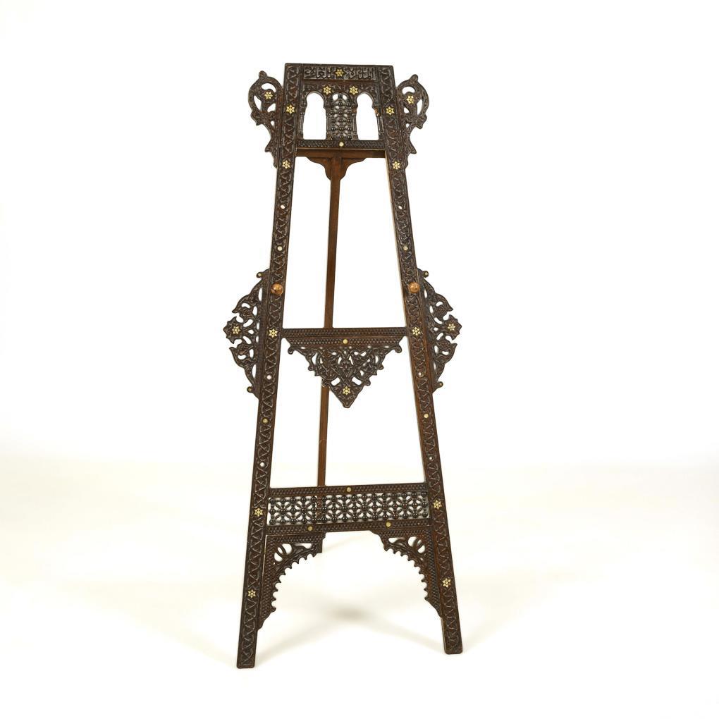 Reich mit Flachschnittornament und Drechselzier sowie einigen Perlmutteinlagen verzierte Staffelei. Steckknäufe für 4 Stellmöglichkeiten. Bekrönung fehlt.