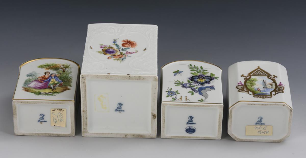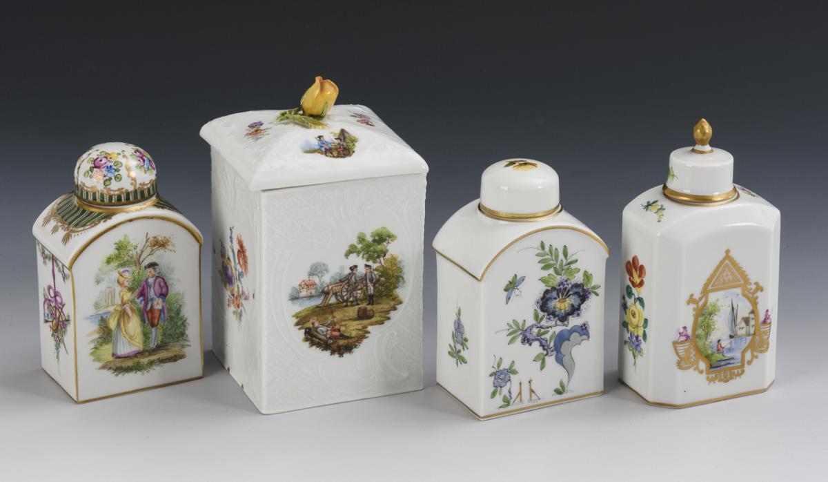 3 verschiedene Teedosen: 1x mit indischer Blumenmalerei, 1x mit Watteaumalerei, 1x mit Landschafts- und Blumenmalerei. / 1 quadratische Dose mit Rosenknaufdeckel sowie Blumenmalerei und Soldatendarstellungen. Minimale Bestoßung am Rosenknauf.