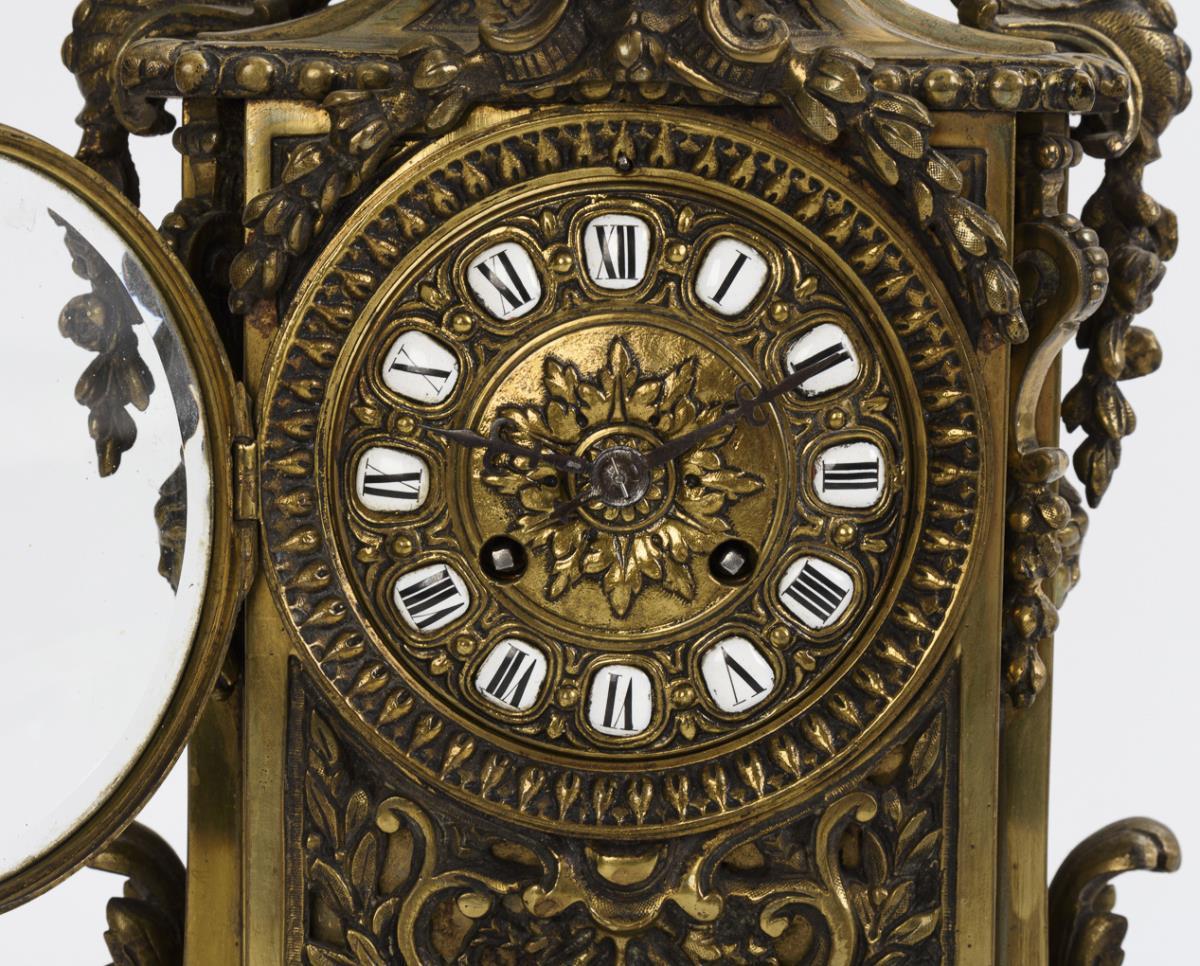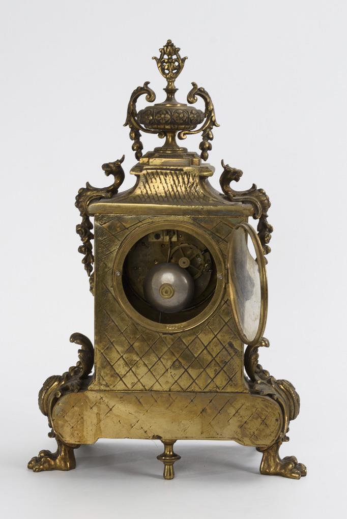 Stufengehäuse mit reichem, historistischem Dekor und Urnenbekrönung. Frontverglasung nicht richtig schließend, defekte Kunststoff-Werkabdeckung.