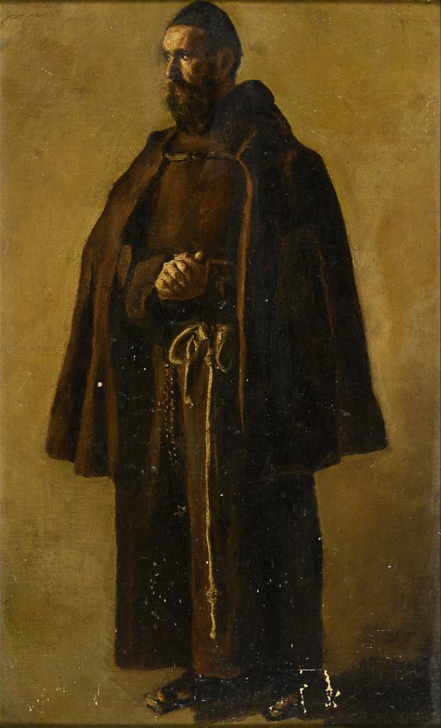 Porträt eines stehenden Mannes mit Bart in der Mönchskutte der Franziskaner. Farbabsplitterungen.