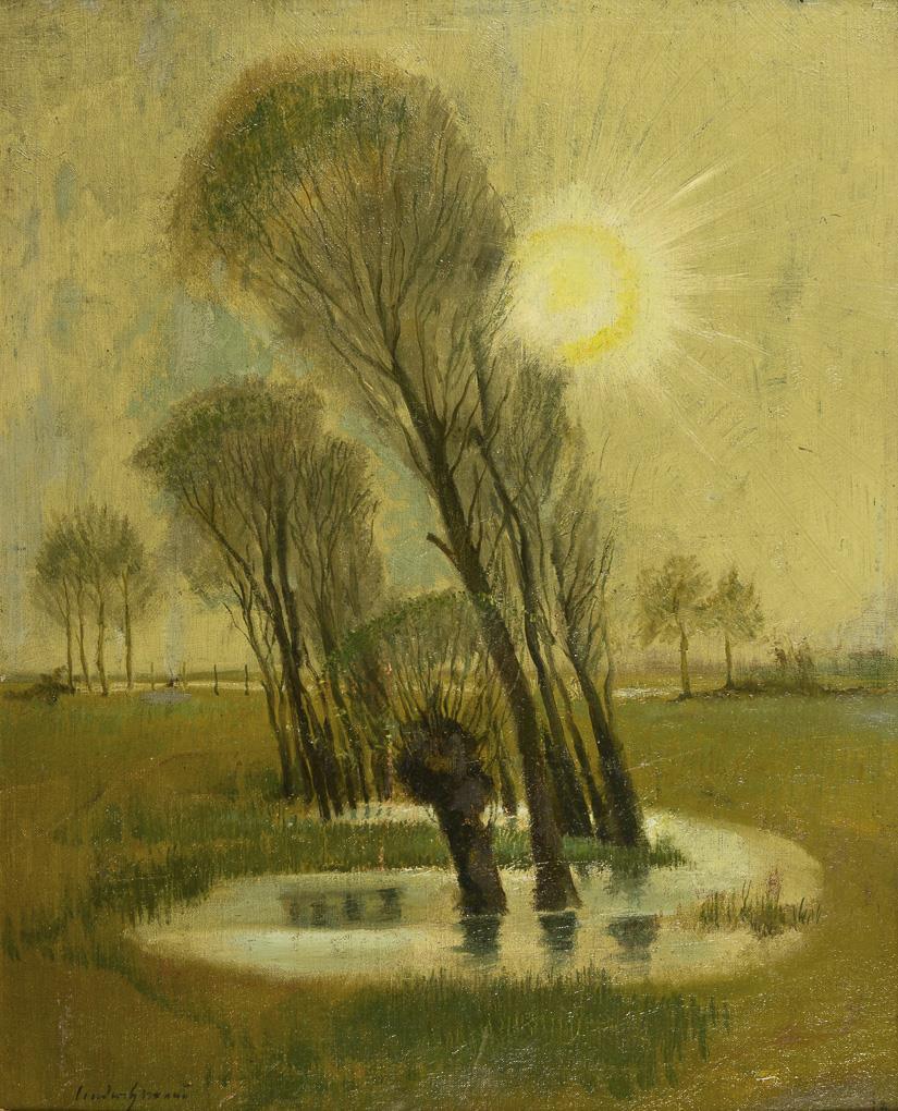Helle Sonne über der flachen Flusslandschaft mit vereinzelt stehenden Bäumen. Altersspuren.