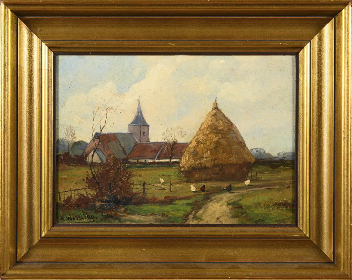 Hühner nahe einer großen Dieme mit Blick zum Dorf mit Kirchturm unter bewölktem Himmel.
