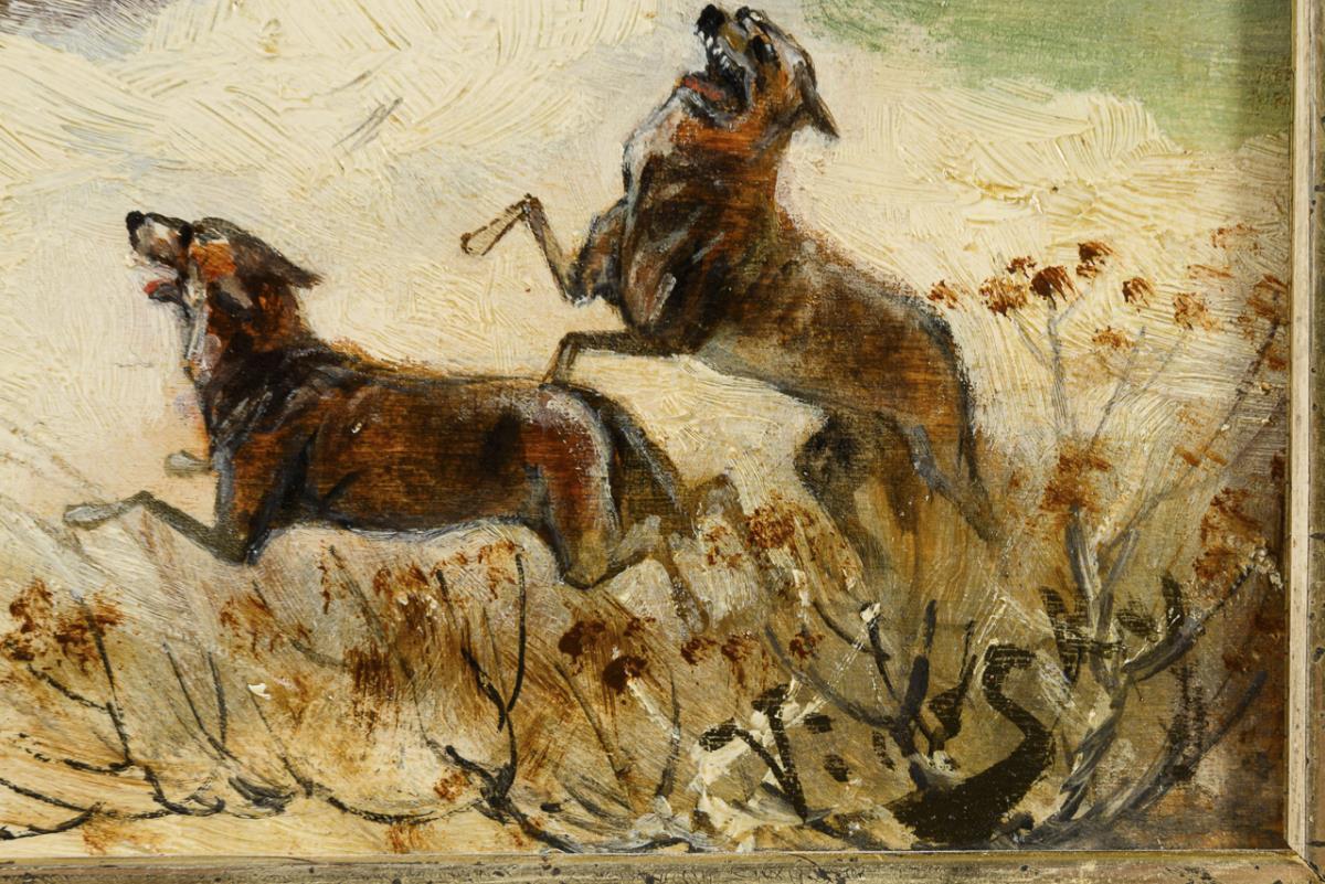 Schlittenfahrer mit vier Pferden im schnellen Galopp durch den Schnee mit verfolgenden Wölfen. Leichte Altersspuren.
